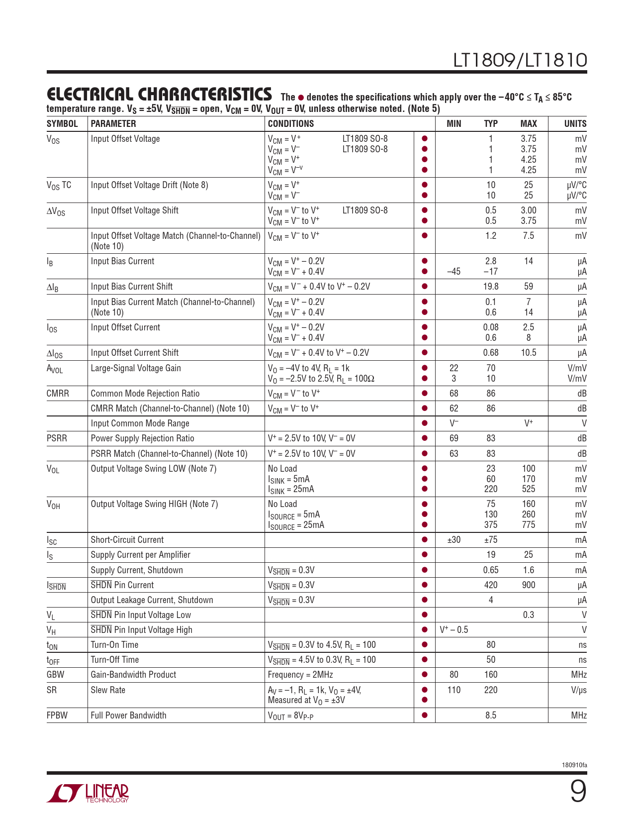 VOS Input Offset Voltage VCM = V + LT1809 SO-8 l 1 3.75 mV VCM = V– LT1809 SO-8 l 1 3.75 mV VCM = V+ l 1 4.25 mV VCM = V–v l 1 4.25 mV VOS TC Input Offset Voltage Drift (Note 8) VCM = V+ l 10 25 μV/°C VCM = V– l 10 25 μV/°C ΔV l OS Input Offset Voltage Shift VCM = V– to V+ LT1809 SO-8 0.5 3.00 mV VCM = V– to V+ l 0.5 3.75 mV Input Offset Voltage Match (Channel-to-Channel) VCM = V– to V+ l 1.2 7.5 mV (Note 10) IB Input Bias Current VCM = V+ – 0.2V l 2.8 14 μA VCM = V– + 0.4V l –45 –17 μA ΔIB Input Bias Current Shift VCM = V – + 0.4V to V+ – 0.2V l 19.8 59 μA Input Bias Current Match (Channel-to-Channel) VCM = V+ – 0.2V l 0.1 7 μA (Note 10) VCM = V– + 0.4V l 0.6 14 μA IOS Input Offset Current VCM = V+ – 0.2V l 0.08 2.5 μA VCM = V– + 0.4V l 0.6 8 μA ΔIOS Input Offset Current Shift VCM = V– + 0.4V to V+ – 0.2V l 0.68 10.5 μA AVOL Large-Signal Voltage Gain VO = –4V to 4V, RL = 1k l 22 70 V/mV VO = –2.5V to 2.5V, RL = 100Ω l 3 10 V/mV CMRR Common Mode Rejection Ratio VCM = V – to V+ l 68 86 dB CMRR Match (Channel-to-Channel) (Note 10) VCM = V– to V+ l 62 86 dB Input Common Mode Range l V– V+ V PSRR Power Supply Rejection Ratio V+ = 2.5V to 10V, V– = 0V l 69 83 dB PSRR Match (Channel-to-Channel) (Note 10) V+ = 2.5V to 10V, V– = 0V l 63 83 dB VOL Output Voltage Swing LOW (Note 7) No Load l 23 100 mV ISINK = 5mA l 60 170 mV ISINK = 25mA l 220 525 mV VOH Output Voltage Swing HIGH (Note 7) No Load l 75 160 mV ISOURCE = 5mA l 130 260 mV ISOURCE = 25mA l 375 775 mV ISC Short-Circuit Current l ±30 ±75 mA IS Supply Current per Amplifi er l 19 25 mA Supply Current, Shutdown VSHDN = 0.3V l 0.65 1.6 mA ISHDN SHDN Pin Current VSHDN = 0.3V l 420 900 μA Output Leakage Current, Shutdown VSHDN = 0.3V l 4 μA VL SHDN Pin Input Voltage Low l 0.3 V VH SHDN Pin Input Voltage High l V+ – 0.5 V tON Turn-On Time VSHDN = 0.3V to 4.5V, RL = 100 l 80 ns tOFF Turn-Off Time VSHDN = 4.5V to 0.3V, RL = 100 l 50 ns GBW Gain-Bandwidth Product Frequency = 2MHz l 80 160 MHz SR Slew Rate AV = –1, RL = 1k, VO = ±4V, l 110 220 V/μs Measured at VO = ±3V l FPBW Full Power Bandwidth VOUT = 8VP-P l 8.5 MHz 180910fa 9