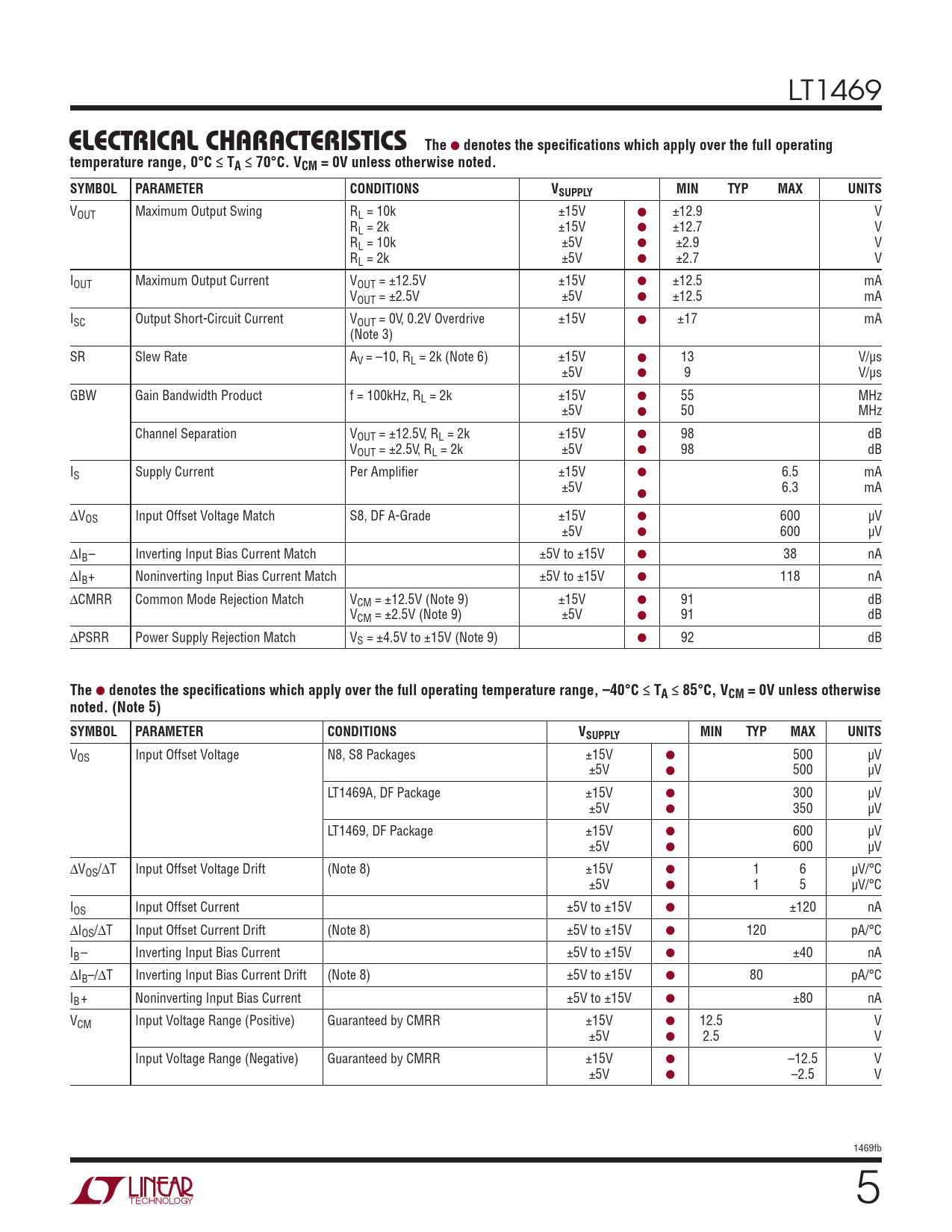 VOS Input Offset Voltage N8, S8 Packages ±15V ● 500 µV ±5V ● 500 µV LT1469A, DF Package ±15V ● 300 µV ±5V ● 350 µV LT1469, DF Package ±15V ● 600 µV ±5V ● 600 µV ∆VOS/∆T Input Offset Voltage Drift (Note 8) ±15V ● 1 6 µV/°C ±5V ● 1 5 µV/°C IOS Input Offset Current ±5V to ±15V ● ±120 nA ∆IOS/∆T Input Offset Current Drift (Note 8) ±5V to ±15V ● 120 pA/°C IB– Inverting Input Bias Current ±5V to ±15V ● ±40 nA ∆IB–/∆T Inverting Input Bias Current Drift (Note 8) ±5V to ±15V ● 80 pA/°C IB+ Noninverting Input Bias Current ±5V to ±15V ● ±80 nA VCM Input Voltage Range (Positive) Guaranteed by CMRR ±15V ● 12.5 V ±5V ● 2.5 V Input Voltage Range (Negative) Guaranteed by CMRR ±15V ● –12.5 V ±5V ● –2.5 V 1469fb 5 Document Outline Features Description Applications Typical Application Absolute Maximum Ratings Pin Configuration Order Information Electrical Characteristics Typical Performance Characteristics Applications Information Typical Applications Simplified Schematic Package Description Revision History Typical Application Related Parts