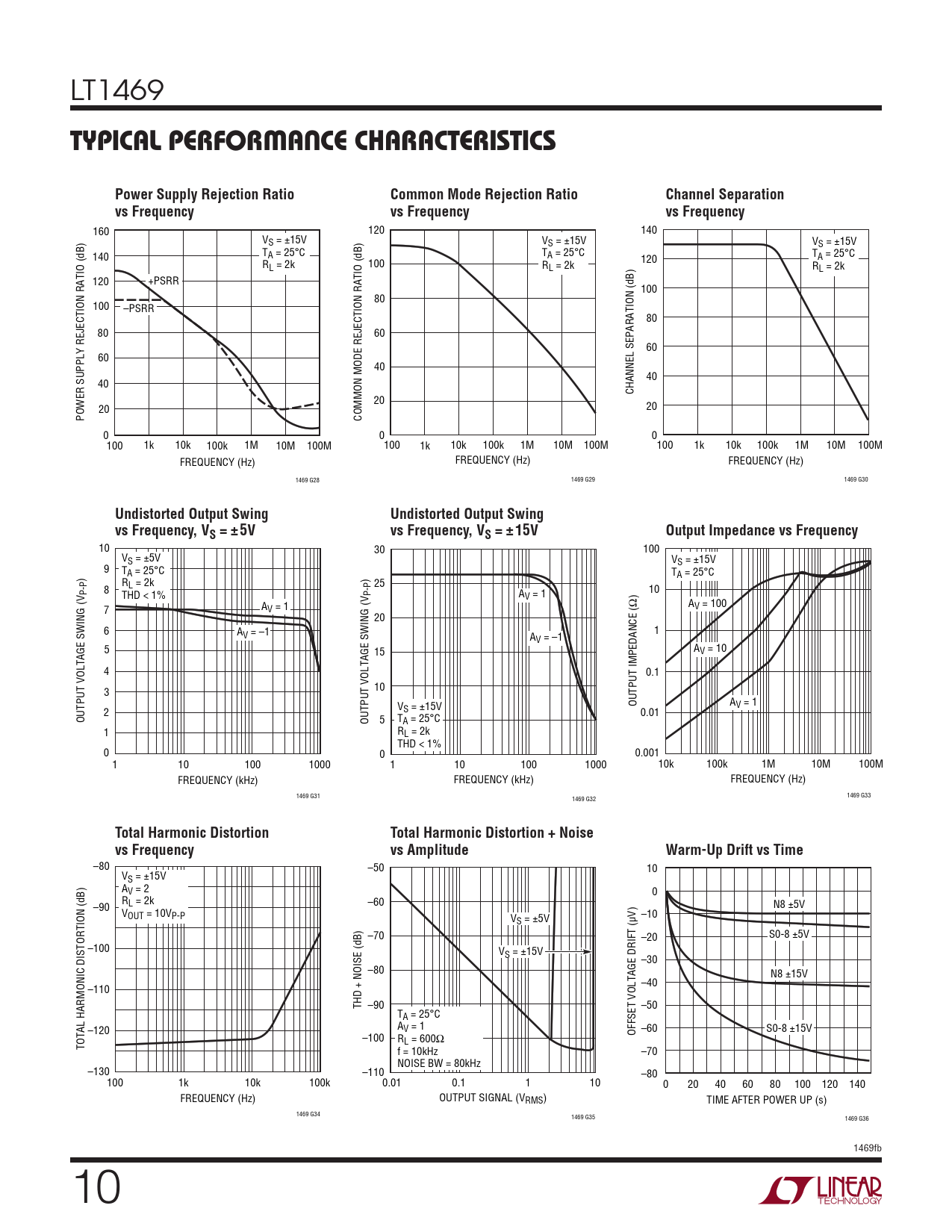 10 30 100 VS = ±5V VS = ±15V 9 T ) A = 25°C TA = 25°C R ) L = 2k 25 P-P 8 THD < 1% P-P A 10 V = 1 7 A A V = 1 V = 100 20 6 AV = –1 A 1 V = –1 5 15 AV = 10 4 0.1 3 10 OUTPUT IMPEDANCE (Ω) AV = 1 2 VS = ±15V 0.01 OUTPUT VOLTAGE SWING (V OUTPUT VOLTAGE SWING (V 5 TA = 25°C 1 RL = 2k THD < 1% 0 0 0.001 1 10 100 1000 1 10 100 1000 10k 100k 1M 10M 100M FREQUENCY (kHz) FREQUENCY (kHz) FREQUENCY (Hz) 1469 G31 1469 G33 1469 G32