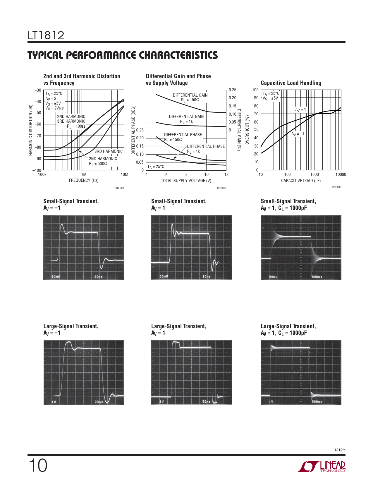 –30 0.25 100 TA = 25°C DIFFERENTIAL GAIN TA = 25°C A 0.20 90 VS = ±5V –40 V = 2 RL = 150Ω VS = ±5V 0.15 80 VO = 2VP-P DIFFERENTIAL GAIN (%) AV = 1 –50 0.10 70 2ND HARMONIC DIFFERENTIAL GAIN 3RD HARMONIC RL = 1k 0.05 60 –60 RL = 100Ω 0.25 0 50 –70 DIFFERENTIAL PHASE AV = –1 0.20 R 40 L = 150Ω OVERSHOOT (%) –80 0.15 DIFFERENTIAL PHASE 30 3RD HARMONIC R HARMONIC DISTORTION (dB) DIFFERENTIAL PHASE (DEG) 0.10 L = 1k 20 –90 2ND HARMONIC R 0.05 10 L = 500Ω TA = 25°C –100 0 0 100k 1M 10M 4 6 8 10 12 10 100 1000 10000 FREQUENCY (Hz) TOTAL SUPPLY VOLTAGE (V) CAPACITIVE LOAD (pF) 1812 G28 1812 G29 1812 G30