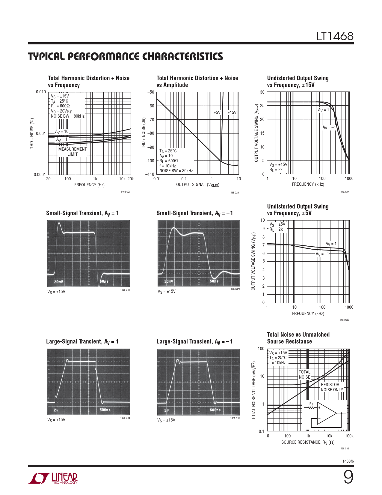 10 VS = ±5V 9 R ) L = 2k P-P 8 7 AV = 1 6 AV = –1 5 4 3 2 OUTPUT VOLTAGE SWING (V VS = ±15V 1468 G31 VS = ±15V 1468 G32 1 0 1 10 100 1000 FREQUENCY (kHz) 1468 G33