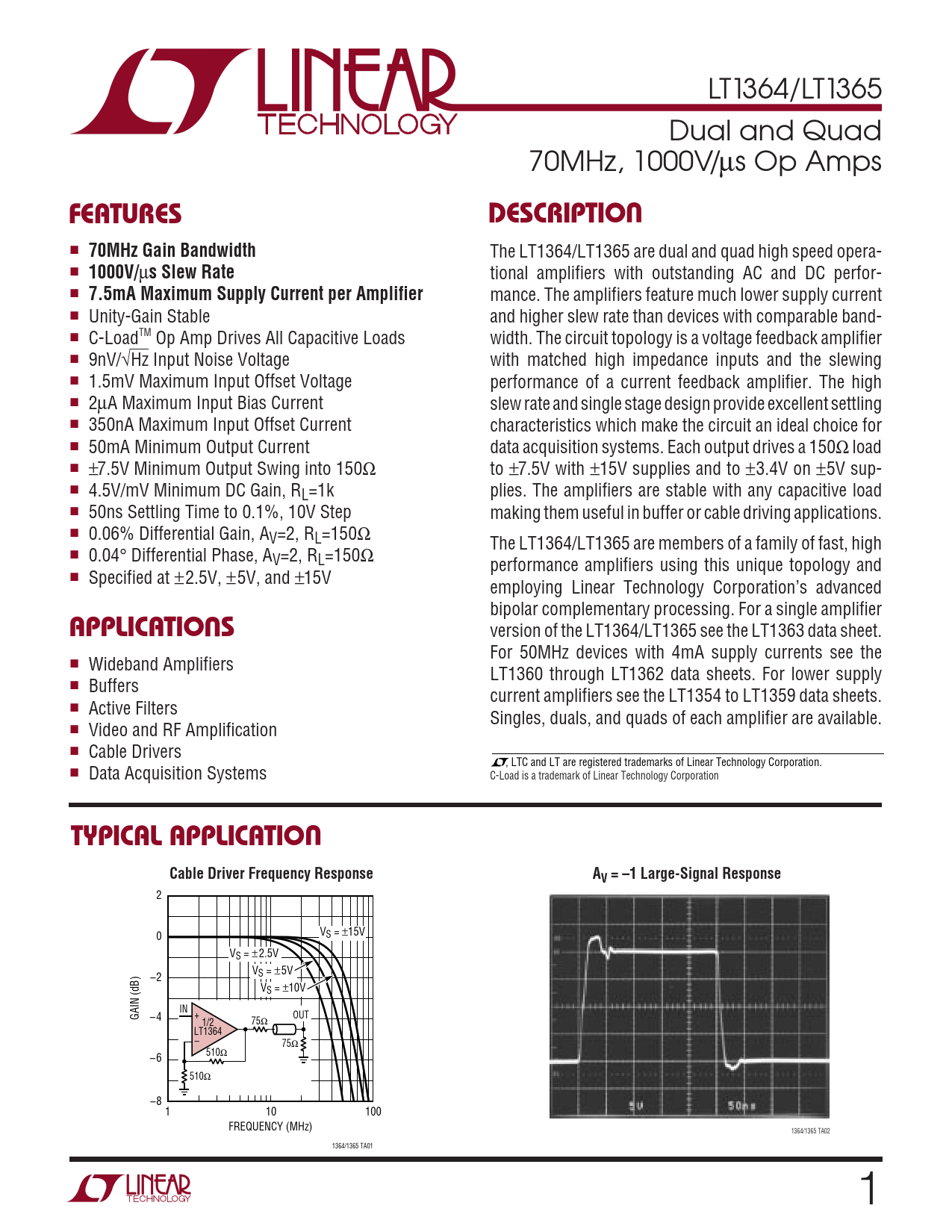 version of the LT1364/LT1365 see the LT1363 data sheet. For 50MHz devices with 4mA supply currents see the ■ Wideband Amplifiers LT1360 through LT1362 data sheets. For lower supply ■ Buffers current amplifiers see the LT1354 to LT1359 data sheets. ■ Active Filters Singles, duals, and quads of each amplifier are available. ■ Video and RF Amplification ■ Cable Drivers , LTC and LT are registered trademarks of Linear Technology Corporation. ■ Data Acquisition Systems C-Load is a trademark of Linear Technology Corporation