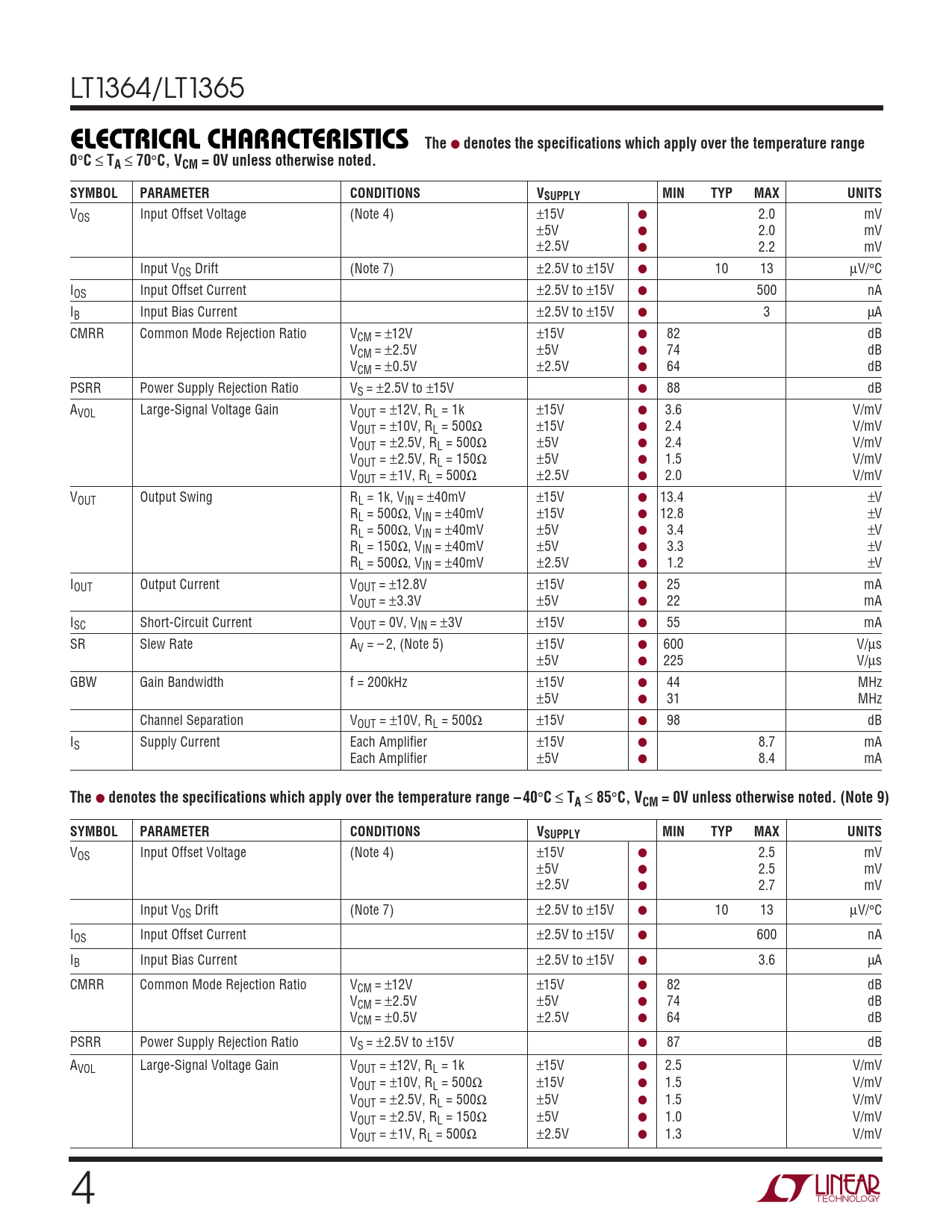 VOS Input Offset Voltage (Note 4) ±15V ● 2.0 mV ±5V ● 2.0 mV ±2.5V ● 2.2 mV Input VOS Drift (Note 7) ±2.5V to ±15V ● 10 13 µV/°C IOS Input Offset Current ±2.5V to ±15V ● 500 nA IB Input Bias Current ±2.5V to ±15V ● 3 µA CMRR Common Mode Rejection Ratio VCM = ±12V ±15V ● 82 dB VCM = ±2.5V ±5V ● 74 dB VCM = ±0.5V ±2.5V ● 64 dB PSRR Power Supply Rejection Ratio VS = ±2.5V to ±15V ● 88 dB AVOL Large-Signal Voltage Gain VOUT = ±12V, RL = 1k ±15V ● 3.6 V/mV VOUT = ±10V, RL = 500Ω ±15V ● 2.4 V/mV VOUT = ±2.5V, RL = 500Ω ±5V ● 2.4 V/mV VOUT = ±2.5V, RL = 150Ω ±5V ● 1.5 V/mV VOUT = ±1V, RL = 500Ω ±2.5V ● 2.0 V/mV VOUT Output Swing RL = 1k, VIN = ±40mV ±15V ● 13.4 ±V RL = 500Ω, VIN = ±40mV ±15V ● 12.8 ±V RL = 500Ω, VIN = ±40mV ±5V ● 3.4 ±V RL = 150Ω, VIN = ±40mV ±5V ● 3.3 ±V RL = 500Ω, VIN = ±40mV ±2.5V ● 1.2 ±V IOUT Output Current VOUT = ±12.8V ±15V ● 25 mA VOUT = ±3.3V ±5V ● 22 mA ISC Short-Circuit Current VOUT = 0V, VIN = ±3V ±15V ● 55 mA SR Slew Rate AV = – 2, (Note 5) ±15V ● 600 V/µs ±5V ● 225 V/µs GBW Gain Bandwidth f = 200kHz ±15V ● 44 MHz ±5V ● 31 MHz Channel Separation VOUT = ±10V, RL = 500Ω ±15V ● 98 dB IS Supply Current Each Amplifier ±15V ● 8.7 mA Each Amplifier ±5V ● 8.4 mA