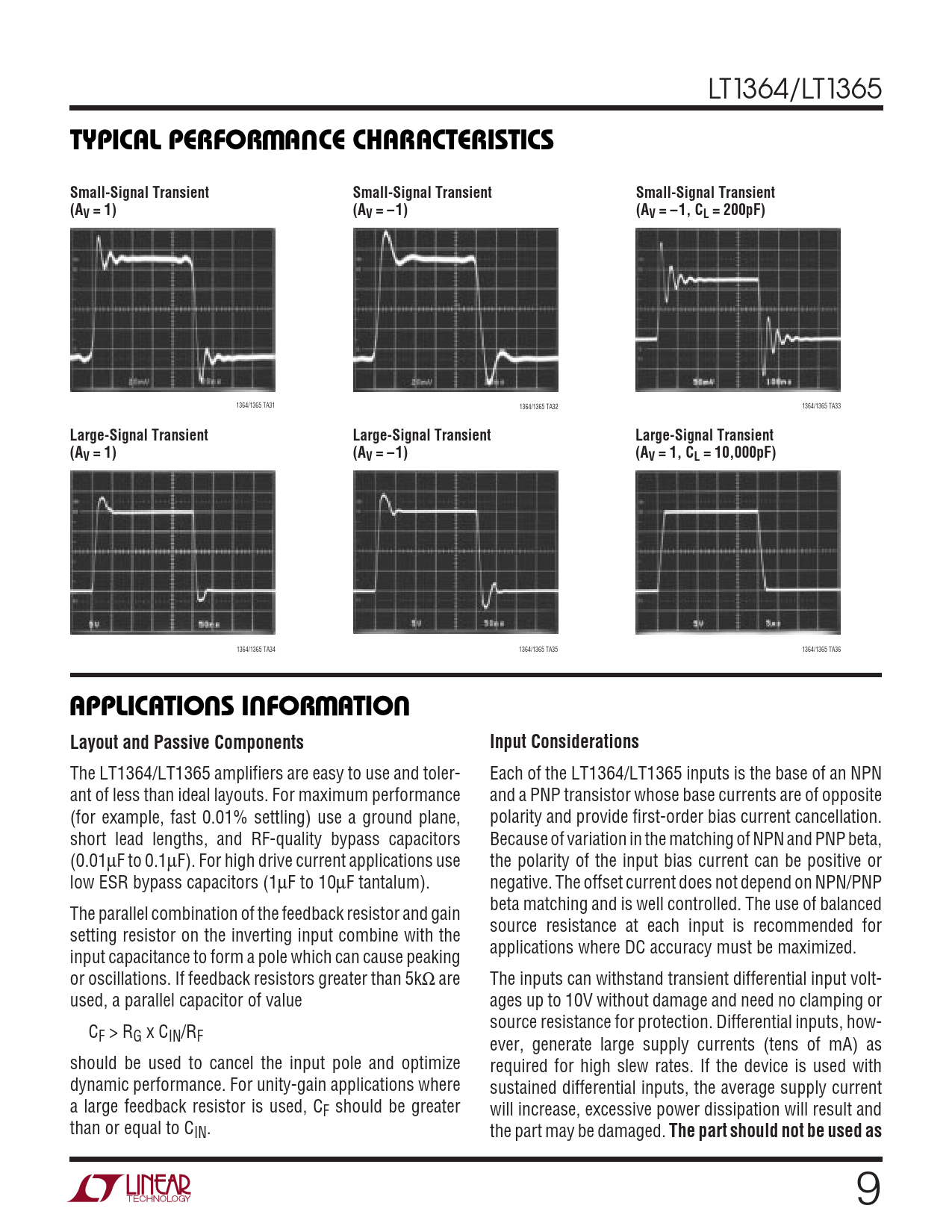 LT1364/LT1365 WUTYPICAL PERFORMANCE CHARACTERISTICSSmall-Signal TransientSmall-Signal TransientSmall-Signal Transient(AV = 1)(AV = –1)(AV = –1, CL = 200pF) 1364/1365 TA31 1364/1365 TA32 1364/1365 TA33 Large-Signal TransientLarge-Signal TransientLarge-Signal Transient(A(A(AV = 1)V = – 1)V = 1, CL = 10,000pF) 1364/1365 TA34 1364/1365 TA35 1364/1365 TA36 UUWUAPPLICATIONS INFORMATIONLayout and Passive ComponentsInput Considerations The LT1364/LT1365 amplifiers are easy to use and toler- Each of the LT1364/LT1365 inputs is the base of an NPN ant of less than ideal layouts. For maximum performance and a PNP transistor whose base currents are of opposite (for example, fast 0.01% settling) use a ground plane, polarity and provide first-order bias current cancellation. short lead lengths, and RF-quality bypass capacitors Because of variation in the matching of NPN and PNP beta, (0.01µF to 0.1µF). For high drive current applications use the polarity of the input bias current can be positive or low ESR bypass capacitors (1µF to 10µF tantalum). negative. The offset current does not depend on NPN/PNP beta matching and is well controlled. The use of balanced The parallel combination of the feedback resistor and gain source resistance at each input is recommended for setting resistor on the inverting input combine with the applications where DC accuracy must be maximized. input capacitance to form a pole which can cause peaking or oscillations. If feedback resistors greater than 5kΩ are The inputs can withstand transient differential input volt- used, a parallel capacitor of value ages up to 10V without damage and need no clamping or source resistance for protection. Differential inputs, how- CF > RG x CIN/RF ever, generate large supply currents (tens of mA) as should be used to cancel the input pole and optimize required for high slew rates. If the device is used with dynamic performance. For unity-gain applications where sustained differential inputs, the average supply current a large feedback resistor is used, CF should be greater will increase, excessive power dissipation will result and than or equal to CIN. the part may be damaged. The part should not be used as 9