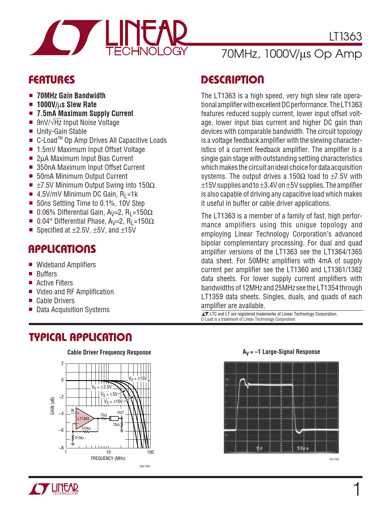 LT1363 70MHz, 1000V/µs Op Amp UFEATURESDESCRIPTIO ■ 70MHz Gain Bandwidth The LT1363 is a high speed, very high slew rate opera- ■ 1000V/ µ s Slew Rate tional amplifier with excellent DC performance. The LT1363 ■ 7.5mA Maximum Supply Current features reduced supply current, lower input offset volt- ■ 9nV/√Hz Input Noise Voltage age, lower input bias current and higher DC gain than ■ Unity-Gain Stable devices with comparable bandwidth. The circuit topology ■ C-LoadTM Op Amp Drives All Capacitive Loads is a voltage feedback amplifier with the slewing character- ■ 1.5mV Maximum Input Offset Voltage istics of a current feedback amplifier. The amplifier is a ■ 2µA Maximum Input Bias Current single gain stage with outstanding settling characteristics ■ 350nA Maximum Input Offset Current which makes the circuit an ideal choice for data acquisition ■ 50mA Minimum Output Current systems. The output drives a 150Ω load to ±7.5V with ■ ±7.5V Minimum Output Swing into 150Ω ±15V supplies and to ±3.4V on ±5V supplies. The amplifier ■ 4.5V/mV Minimum DC Gain, RL=1k is also capable of driving any capacitive load which makes ■ 50ns Settling Time to 0.1%, 10V Step it useful in buffer or cable driver applications. ■ 0.06% Differential Gain, AV=2, RL=150Ω The LT1363 is a member of a family of fast, high perfor- ■ 0.04° Differential Phase, AV=2, RL=150Ω mance amplifiers using this unique topology and ■ Specified at ±2.5V, ±5V, and ±15V employing Linear Technology Corporation’s advanced U bipolar complementary processing. For dual and quad APPLICATIO S amplifier versions of the LT1363 see the LT1364/1365 data sheet. For 50MHz amplifiers with 4mA of supply ■ Wideband Amplifiers current per amplifier see the LT1360 and LT1361/1362 ■ Buffers data sheets. For lower supply current amplifiers with ■ Active Filters bandwidths of 12MHz and 25MHz see the LT1354 through ■ Video and RF Amplification LT1359 data sheets. Singles, duals, and quads of each ■ Cable Drivers amplifier are available. ■ Data Acquisition Systems , LTC and LT are registered trademarks of Linear Technology Corporation. C-Load is a trademark of Linear Technology Corporation UTYPICAL APPLICATIOCable Driver Frequency ResponseAV = –1 Large-Signal Response 2 0 VS = ±15V VS = ±2.5V V –2 S = ± 5V VS = ±10V IN GAIN (dB) –4 + 75Ω OUT LT1363 – 75Ω 510Ω –6 510Ω –8 1 10 100 FREQUENCY (MHz) 1363 TA02 1363 TA01 1