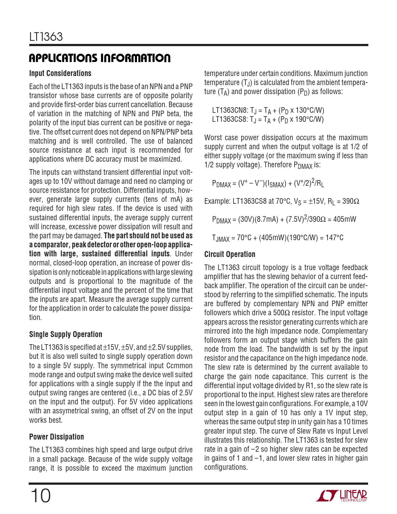 LT1363 UUWUAPPLICATIONS INFORMATIONInput Considerations temperature under certain conditions. Maximum junction temperature (T Each of the LT1363 inputs is the base of an NPN and a PNP J) is calculated from the ambient tempera- ture (T transistor whose base currents are of opposite polarity A) and power dissipation (PD) as follows: and provide first-order bias current cancellation. Because LT1363CN8: T of variation in the matching of NPN and PNP beta, the J = TA + (PD x 130°C/W) polarity of the input bias current can be positive or nega- LT1363CS8: TJ = TA + (PD x 190°C/W) tive. The offset current does not depend on NPN/PNP beta matching and is well controlled. The use of balanced Worst case power dissipation occurs at the maximum source resistance at each input is recommended for supply current and when the output voltage is at 1/2 of applications where DC accuracy must be maximized. either supply voltage (or the maximum swing if less than 1/2 supply voltage). Therefore PDMAX is: The inputs can withstand transient differential input volt- ages up to 10V without damage and need no clamping or PDMAX = (V+ – V–)(ISMAX) + (V+/2)2/RL source resistance for protection. Differential inputs, how- ever, generate large supply currents (tens of mA) as Example: LT1363CS8 at 70°C, VS = ±15V, RL = 390Ω required for high slew rates. If the device is used with sustained differential inputs, the average supply current PDMAX = (30V)(8.7mA) + (7.5V)2/390Ω = 405mW will increase, excessive power dissipation will result and the part may be damaged. The part should not be used as TJMAX = 70°C + (405mW)(190°C/W) = 147°C a comparator, peak detector or other open-loop applica- tion with large, sustained differential inputs . Under Circuit Operation normal, closed-loop operation, an increase of power dis- The LT1363 circuit topology is a true voltage feedback sipation is only noticeable in applications with large slewing amplifier that has the slewing behavior of a current feed- outputs and is proportional to the magnitude of the back amplifier. The operation of the circuit can be under- differential input voltage and the percent of the time that stood by referring to the simplified schematic. The inputs the inputs are apart. Measure the average supply current are buffered by complementary NPN and PNP emitter for the application in order to calculate the power dissipa- followers which drive a 500Ω resistor. The input voltage tion. appears across the resistor generating currents which are Single Supply Operation mirrored into the high impedance node. Complementary followers form an output stage which buffers the gain The LT1363 is specified at ±15V, ±5V, and ±2.5V supplies, node from the load. The bandwidth is set by the input but it is also well suited to single supply operation down resistor and the capacitance on the high impedance node. to a single 5V supply. The symmetrical input Ccmmon The slew rate is determined by the current available to mode range and output swing make the device well suited charge the gain node capacitance. This current is the for applications with a single supply if the the input and differential input voltage divided by R1, so the slew rate is output swing ranges are centered (i.e., a DC bias of 2.5V proportional to the input. Highest slew rates are therefore on the input and the output). For 5V video applications seen in the lowest gain configurations. For example, a 10V with an assymetrical swing, an offset of 2V on the input output step in a gain of 10 has only a 1V input step, works best. whereas the same output step in unity gain has a 10 times greater input step. The curve of Slew Rate vs Input Level Power Dissipation illustrates this relationship. The LT1363 is tested for slew The LT1363 combines high speed and large output drive rate in a gain of –2 so higher slew rates can be expected in a small package. Because of the wide supply voltage in gains of 1 and –1, and lower slew rates in higher gain range, it is possible to exceed the maximum junction configurations. 10