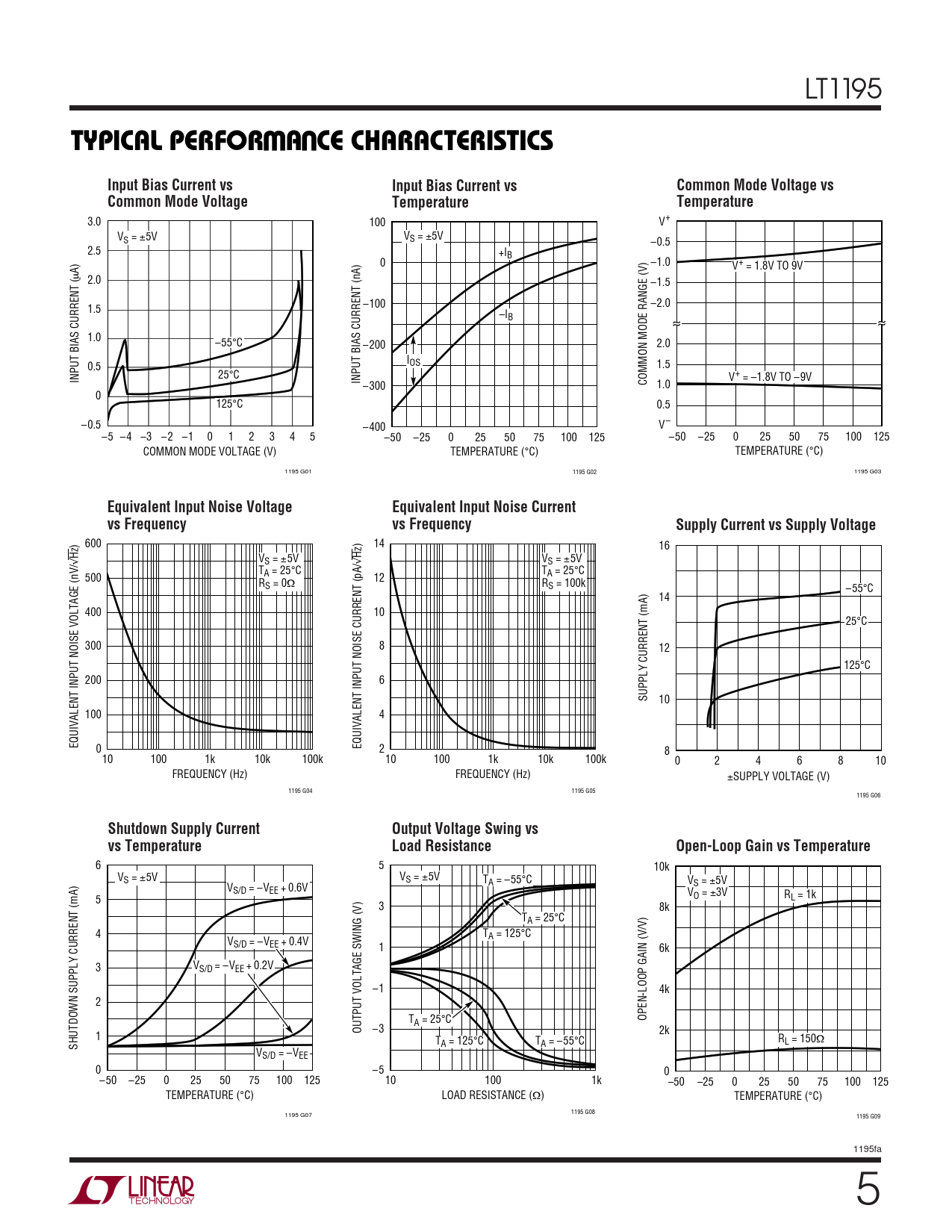 6 5 10k V V S = ±5V S = ±5V TA = –55°C VS = ±5V VS/D = –VEE + 0.6V VO = ±3V RL = 1k 5 3 8k TA = 25°C 4 TA = 125°C VS/D = –VEE + 0.4V 1 6k 3 VS/D = –VEE + 0.2V –1 4k 2 T OPEN-LOOP GAIN (V/V) A = 25°C OUTPUT VOLTAGE SWING (V) –3 2k 1 T R A = 125°C TA = –55°C L = 150Ω SHUTDOWN SUPPLY CURRENT (mA) VS/D = –VEE 0 –5 0 –50 –25 0 25 50 75 100 125 10 100 1k –50 –25 0 25 50 75 100 125 TEMPERATURE (°C) LOAD RESISTANCE (Ω) TEMPERATURE (°C) 1195 G08 1195 G07 1195 G09 1195fa 5