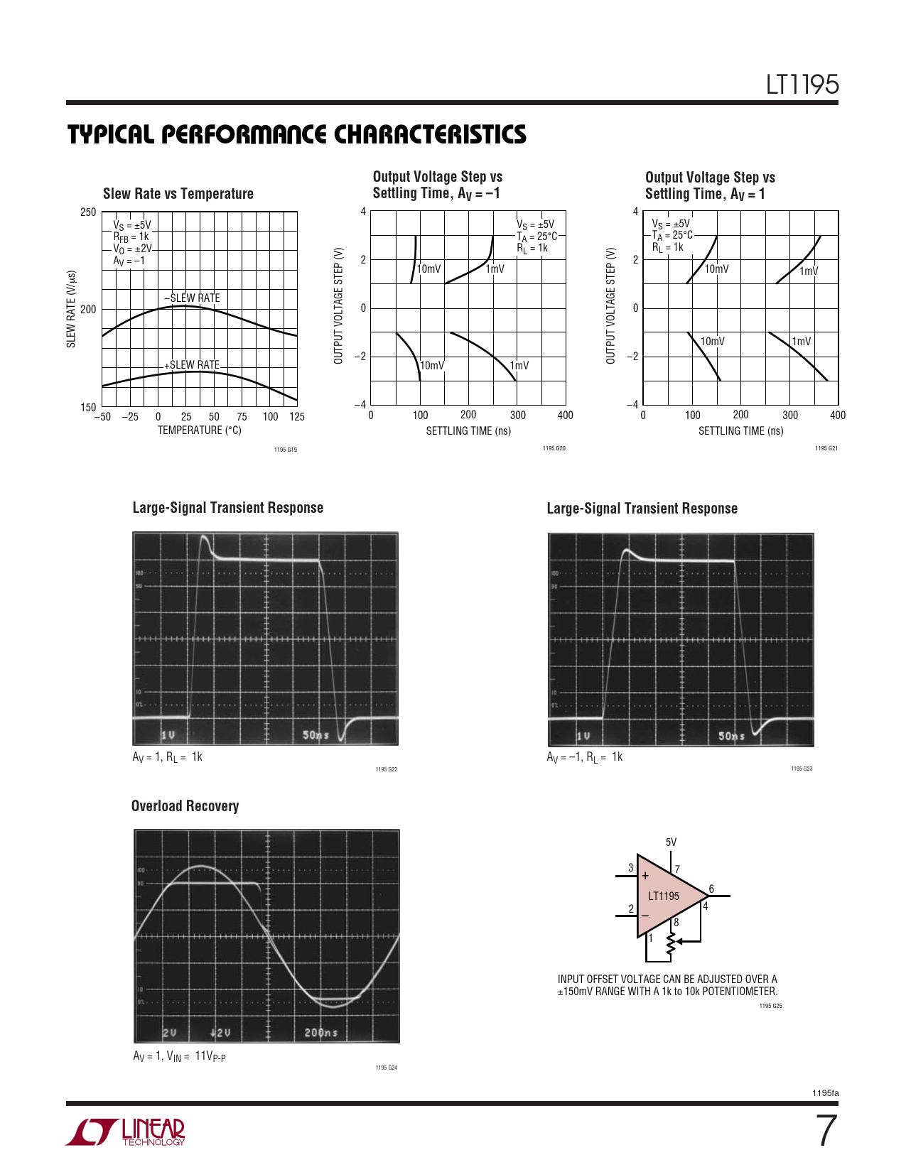 5V 3 + 7 6 LT1195 2 4 – 8 1 INPUT OFFSET VOLTAGE CAN BE ADJUSTED OVER A ±150mV RANGE WITH A 1k to 10k POTENTIOMETER. 1195 G25 AV = 1, VIN = 11VP-P 1195 G24 1195fa 7