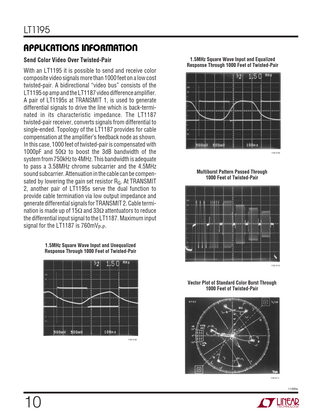 U U W U APPLICATIO S I FOR ATIO Send Color Video Over Twisted-Pair 1.5MHz Square Wave Input and Equalized Response Through 1000 Feet of Twisted-Pair