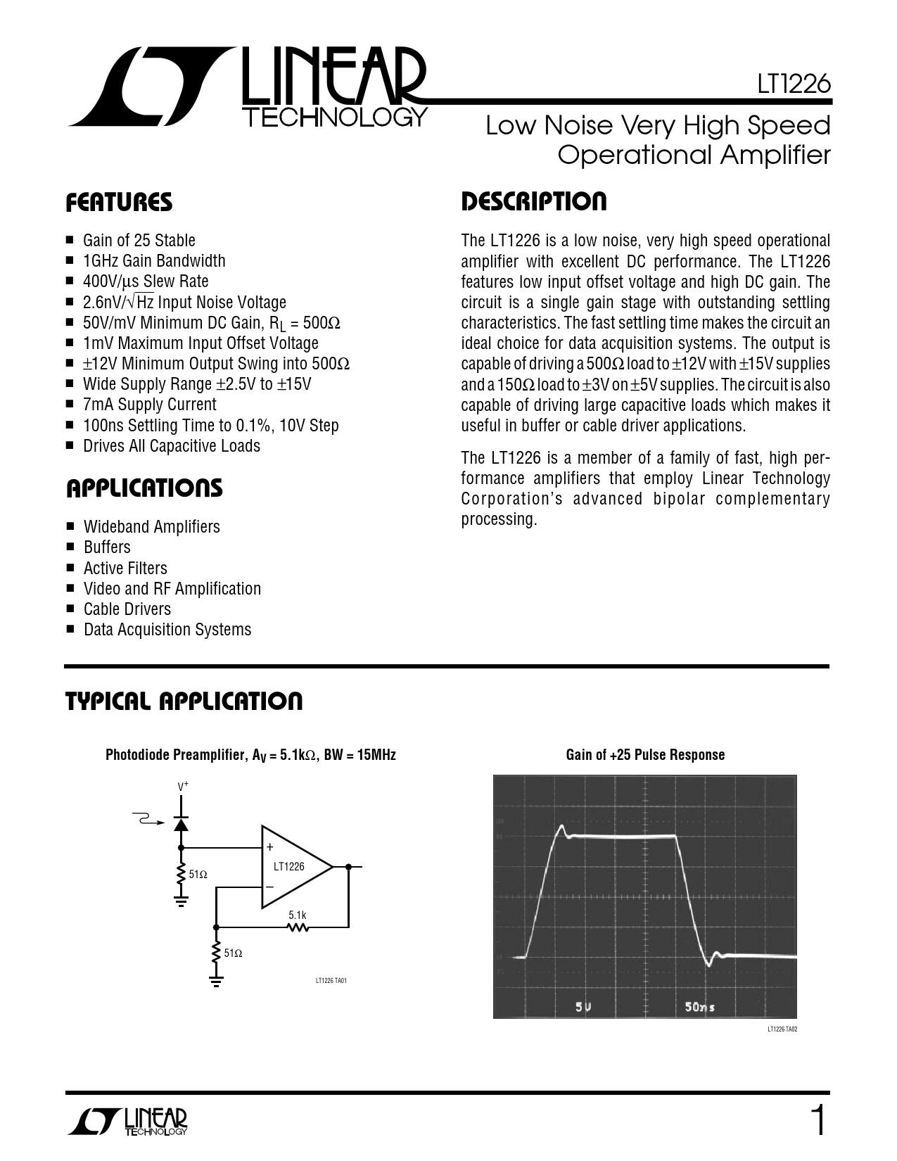 LT1226 Low Noise Very High Speed Operational Amplifier UFEATUSREDESCRIPTIO ■ Gain of 25 Stable The LT1226 is a low noise, very high speed operational ■ 1GHz Gain Bandwidth amplifier with excellent DC performance. The LT1226 ■ 400V/µs Slew Rate features low input offset voltage and high DC gain. The ■ 2.6nV/√Hz Input Noise Voltage circuit is a single gain stage with outstanding settling ■ 50V/mV Minimum DC Gain, RL = 500Ω characteristics. The fast settling time makes the circuit an ■ 1mV Maximum Input Offset Voltage ideal choice for data acquisition systems. The output is ■ ±12V Minimum Output Swing into 500Ω capable of driving a 500Ω load to ±12V with ±15V supplies ■ Wide Supply Range ±2.5V to ±15V and a 150Ω load to ±3V on ±5V supplies. The circuit is also ■ 7mA Supply Current capable of driving large capacitive loads which makes it ■ 100ns Settling Time to 0.1%, 10V Step useful in buffer or cable driver applications. ■ Drives All Capacitive Loads The LT1226 is a member of a family of fast, high per- OU formance amplifiers that employ Linear Technology APPLICATIS Corporation’s advanced bipolar complementary processing. ■ Wideband Amplifiers ■ Buffers ■ Active Filters ■ Video and RF Amplification ■ Cable Drivers ■ Data Acquisition Systems OUTYPICAL APPLICATIPhotodiode Preamplifier, AV = 5.1k Ω , BW = 15MHzGain of +25 Pulse Response V+ + LT1226 51Ω – 5.1k 51Ω LT1226 TA01 LT1226 TA02 1