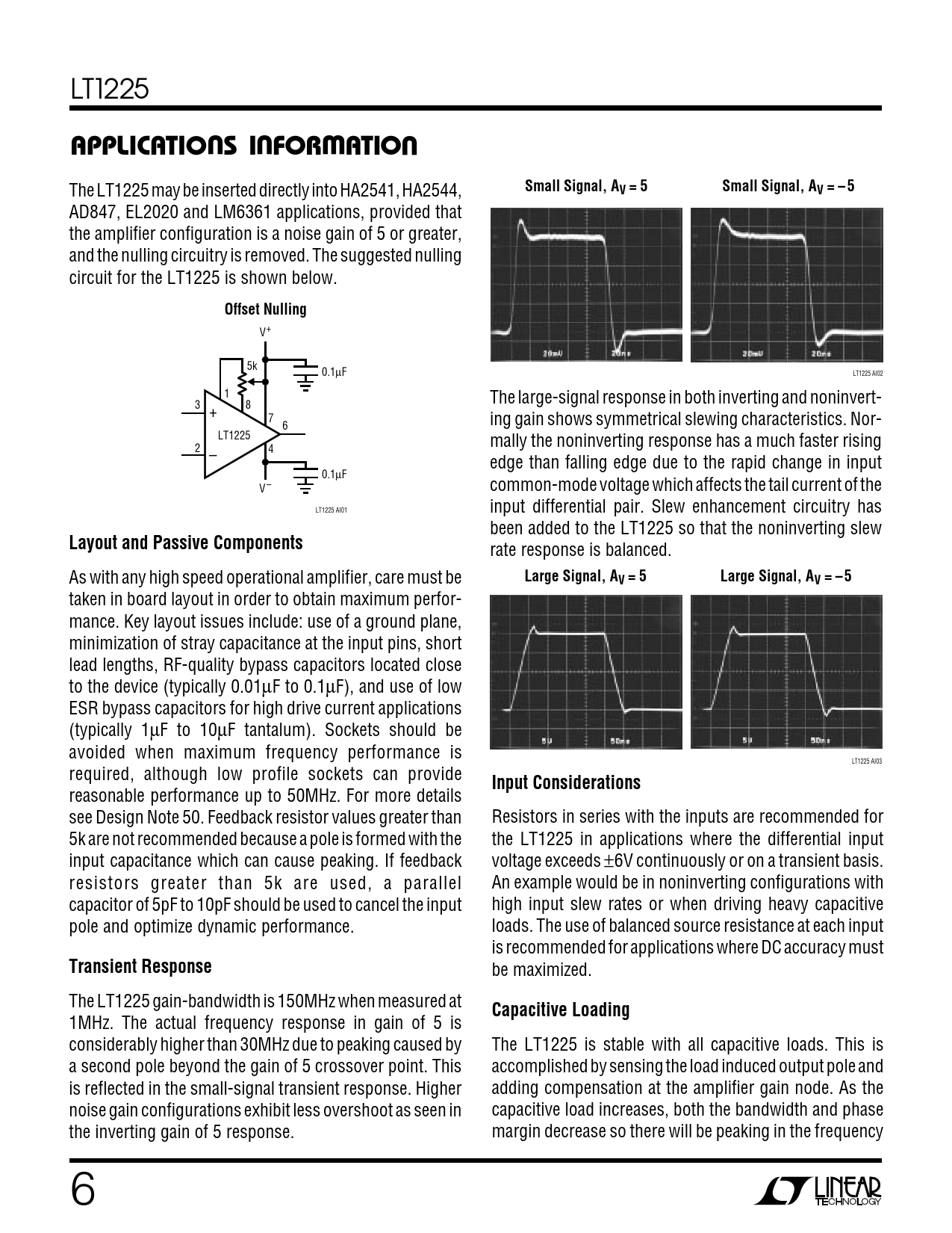 AD847, EL2020 and LM6361 applications, provided that the amplifier configuration is a noise gain of 5 or greater, and the nulling circuitry is removed. The suggested nulling circuit for the LT1225 is shown below.