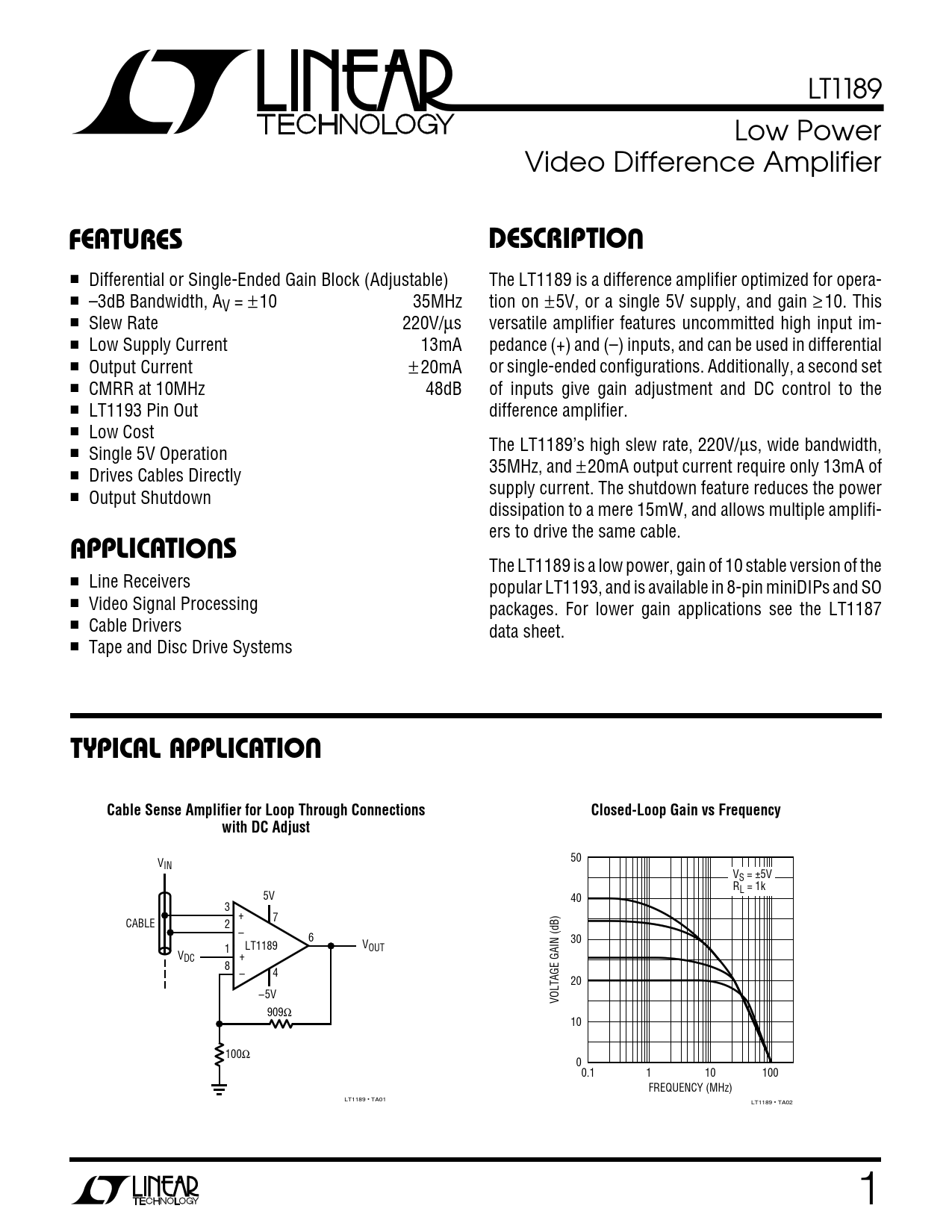 LT1189 Low Power Video Difference Amplifier UFEATUSREDESCRIPTIO ■ Differential or Single-Ended Gain Block (Adjustable) The LT1189 is a difference amplifier optimized for opera- ■ –3dB Bandwidth, A tion on V = ± 10 35MHz ±5V, or a single 5V supply, and gain ≥10. This ■ Slew Rate 220V/µs versatile amplifier features uncommitted high input im- ■ Low Supply Current 13mA pedance (+) and (–) inputs, and can be used in differential ■ Output Current ±20mA or single-ended configurations. Additionally, a second set ■ CMRR at 10MHz 48dB of inputs give gain adjustment and DC control to the ■ LT1193 Pin Out difference amplifier. ■ Low Cost The LT1189’s high slew rate, 220V/µs, wide bandwidth, ■ Single 5V Operation 35MHz, and ±20mA output current require only 13mA of ■ Drives Cables Directly supply current. The shutdown feature reduces the power ■ Output Shutdown dissipation to a mere 15mW, and allows multiple amplifi- OU ers to drive the same cable. APPLICATIS The LT1189 is a low power, gain of 10 stable version of the ■ Line Receivers popular LT1193, and is available in 8-pin miniDIPs and SO ■ Video Signal Processing packages. For lower gain applications see the LT1187 ■ Cable Drivers data sheet. ■ Tape and Disc Drive Systems OUTYPICAL APPLICATICable Sense Amplifier for Loop Through ConnectionsClosed-Loop Gain vs Frequencywith DC Adjust 50 VIN VS = ±5V RL = 1k 5V 40 3 + 7 CABLE 2 – 6 30 LT1189 1 VOUT VDC + 8 – 4 20 –5V VOLTAGE GAIN (dB) 909Ω 10 100Ω 00.1 1 10 100 FREQUENCY (MHz) LT1189 • TA01 LT1189 • TA02 1