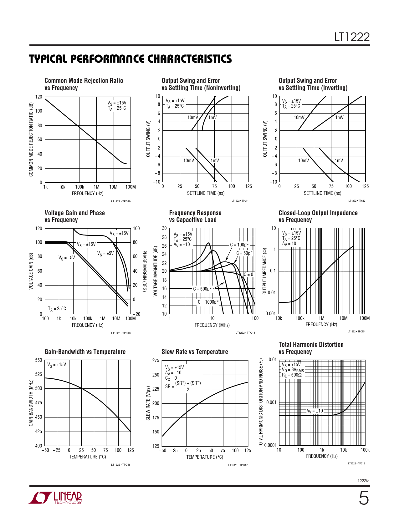 550 275 0.01 VS = ±15V V V S = ±15V S = ±15V VO = 3VRMS 525 A 250 V = –10 R C L = 500Ω C = 0 (SR+) + (SR–) 500 SR = μs) 225 2 475 200 0.001 AV = ±10 450 SLEW RATE (V/ 175 GAIN-BANDWIDTH (MHz) 425 150 400 125 TOTAL HARMONIC DISTORTION AND NOISE (%) 0.0001 – 50 – 25 0 25 50 75 100 125 – 50 – 25 0 25 50 75 100 125 10 100 1k 10k 100k TEMPERATURE (°C) TEMPERATURE (°C) FREQUENCY (Hz) LT1222 • TPC18 LT1222 • TPC16 LT1222 • TPC17 1222fc 5