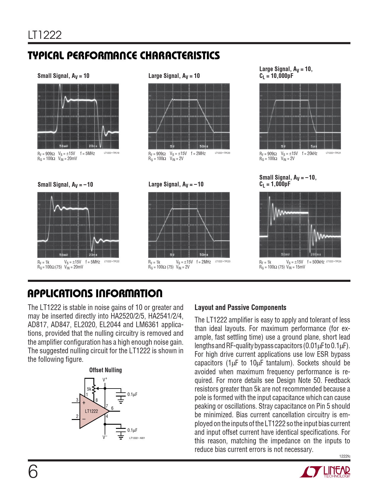 LT1222 WUTYPICAL PERFORMANCE CHARACTERISTICSLarge Signal, AV = 10,Small Signal, ALarge Signal, AV = 10V = 10CL = 10,000pF R LT1222 • TPC19 LT1222 • TPC20 LT1222 • TPC21 F = 909Ω VS = ±15V f = 5MHz RF = 909Ω VS = ±15V f = 2MHz RF = 909Ω VS = ±15V f = 20kHz RG = 100Ω VIN = 20mV RG = 100Ω VIN = 2V RG = 100Ω VIN = 2V Small Signal, AV = – 10,Small Signal, AV = – 10Large Signal, AV = – 10CL = 1,000pF LT1222 • TPC22 LT1222 • TPC23 LT1222 • TPC24 R VS = ±15V f = 5MHz R F = 1k F = 1k VS = ±15V f = 2MHz RF = 1k VS = ±15V f = 500kHz R VIN = 20mV R G = 100Ω (75) G = 100Ω (75) VIN = 2V RG = 100Ω (75) VIN = 15mV UUWUAPPLICATIONS INFORMATION The LT1222 is stable in noise gains of 10 or greater and Layout and Passive Components may be inserted directly into HA2520/2/5, HA2541/2/4, The LT1222 amplifier is easy to apply and tolerant of less AD817, AD847, EL2020, EL2044 and LM6361 applica- than ideal layouts. For maximum performance (for ex- tions, provided that the nulling circuitry is removed and ample, fast settling time) use a ground plane, short lead the amplifier configuration has a high enough noise gain. lengths and RF-quality bypass capacitors (0.01μF to 0.1μF). The suggested nulling circuit for the LT1222 is shown in For high drive current applications use low ESR bypass the following figure. capacitors (1μF to 10μF tantalum). Sockets should be Offset Nulling avoided when maximum frequency performance is re- V+ quired. For more details see Design Note 50. Feedback 5k resistors greater than 5k are not recommended because a 1 0.1μF 3 pole is formed with the input capacitance which can cause 8 + 7 6 peaking or oscillations. Stray capacitance on Pin 5 should LT1222 2 4 be minimized. Bias current cancellation circuitry is em- – ployed on the inputs of the LT1222 so the input bias current 0.1μF and input offset current have identical specifications. For V– LT1222 • AI01 this reason, matching the impedance on the inputs to reduce bias current errors is not necessary. 1222fc 6