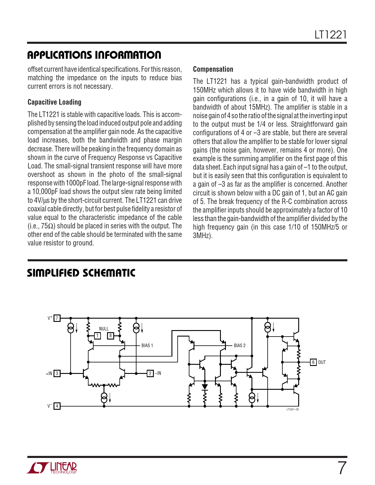 LT1221 UUWUAPPLICATIONS INFORMATION offset current have identical specifications. For this reason, Compensation matching the impedance on the inputs to reduce bias The LT1221 has a typical gain-bandwidth product of current errors is not necessary. 150MHz which allows it to have wide bandwidth in high gain configurations (i.e., in a gain of 10, it will have a Capacitive Loading bandwidth of about 15MHz). The amplifier is stable in a The LT1221 is stable with capacitive loads. This is accom- noise gain of 4 so the ratio of the signal at the inverting input plished by sensing the load induced output pole and adding to the output must be 1/4 or less. Straightforward gain compensation at the amplifier gain node. As the capacitive configurations of 4 or –3 are stable, but there are several load increases, both the bandwidth and phase margin others that allow the amplifier to be stable for lower signal decrease. There will be peaking in the frequency domain as gains (the noise gain, however, remains 4 or more). One shown in the curve of Frequency Response vs Capacitive example is the summing amplifier on the first page of this Load. The small-signal transient response will have more data sheet. Each input signal has a gain of –1 to the output, overshoot as shown in the photo of the small-signal but it is easily seen that this configuration is equivalent to response with 1000pF load. The large-signal response with a gain of –3 as far as the amplifier is concerned. Another a 10,000pF load shows the output slew rate being limited circuit is shown below with a DC gain of 1, but an AC gain to 4V/µs by the short-circuit current. The LT1221 can drive of 5. The break frequency of the R-C combination across coaxial cable directly, but for best pulse fidelity a resistor of the amplifier inputs should be approximately a factor of 10 value equal to the characteristic impedance of the cable less than the gain-bandwidth of the amplifier divided by the (i.e., 75Ω) should be placed in series with the output. The high frequency gain (in this case 1/10 of 150MHz/5 or other end of the cable should be terminated with the same 3MHz). value resistor to ground. WWSI PLIFIED SCHE ATIC V+ 7 NULL 1 8 BIAS 1 BIAS 2 6 OUT +IN 3 2 –IN V – 4 LT1221 • SS 7