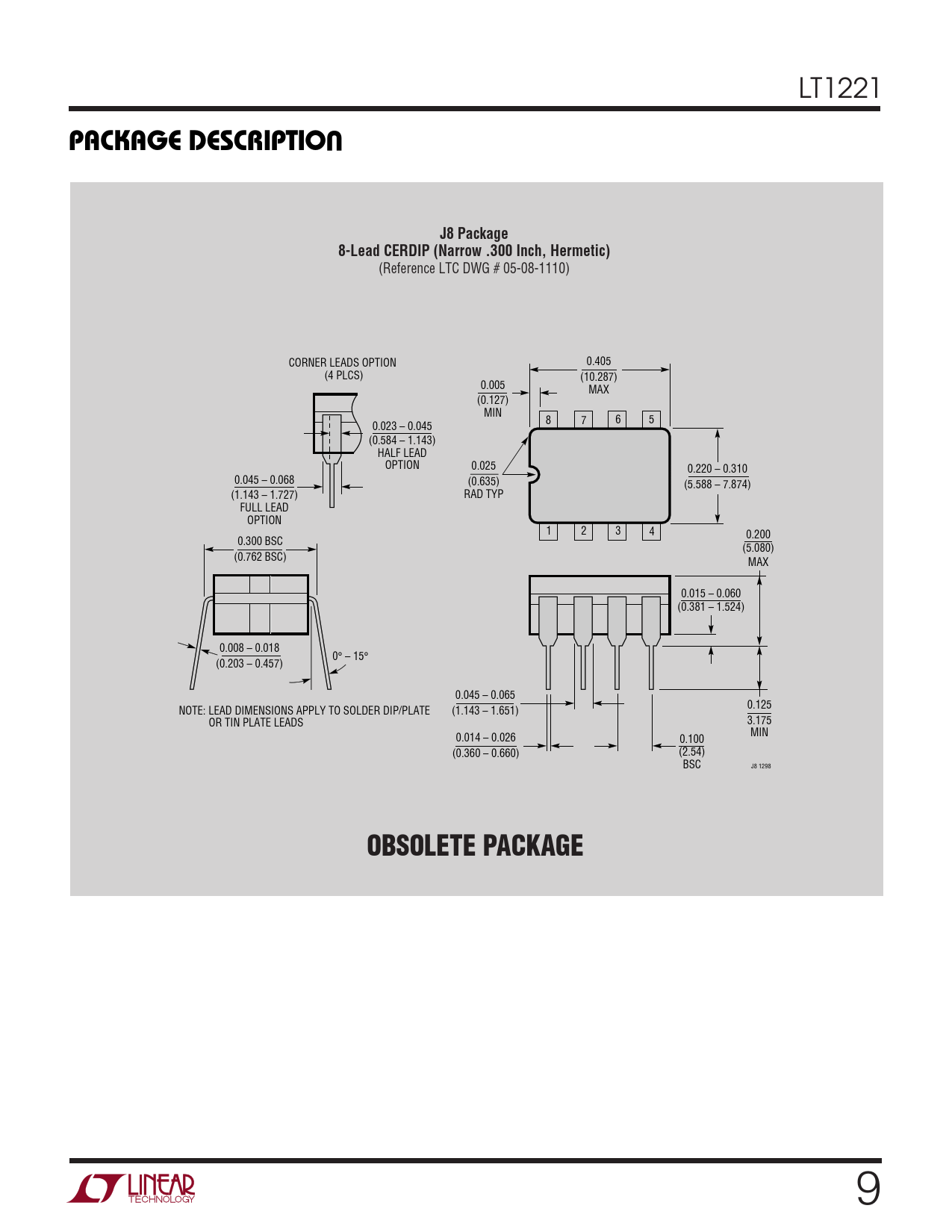 (Reference LTC DWG # 05-08-1110) CORNER LEADS OPTION 0.405 (4 PLCS) (10.287) 0.005 MAX (0.127) MIN 8 7 6 5 0.023 – 0.045 (0.584 – 1.143) HALF LEAD OPTION 0.025 0.220 – 0.310 0.045 – 0.068 (0.635) (5.588 – 7.874) (1.143 – 1.727) RAD TYP FULL LEAD OPTION 1 2 3 4 0.200 0.300 BSC (5.080) (0.762 BSC) MAX 0.015 – 0.060 (0.381 – 1.524) 0.008 – 0.018 0° – 15° (0.203 – 0.457) 0.045 – 0.065 0.125 NOTE: LEAD DIMENSIONS APPLY TO SOLDER DIP/PLATE (1.143 – 1.651) 3.175 OR TIN PLATE LEADS MIN 0.014 – 0.026 0.100 (0.360 – 0.660) (2.54) BSC J8 1298