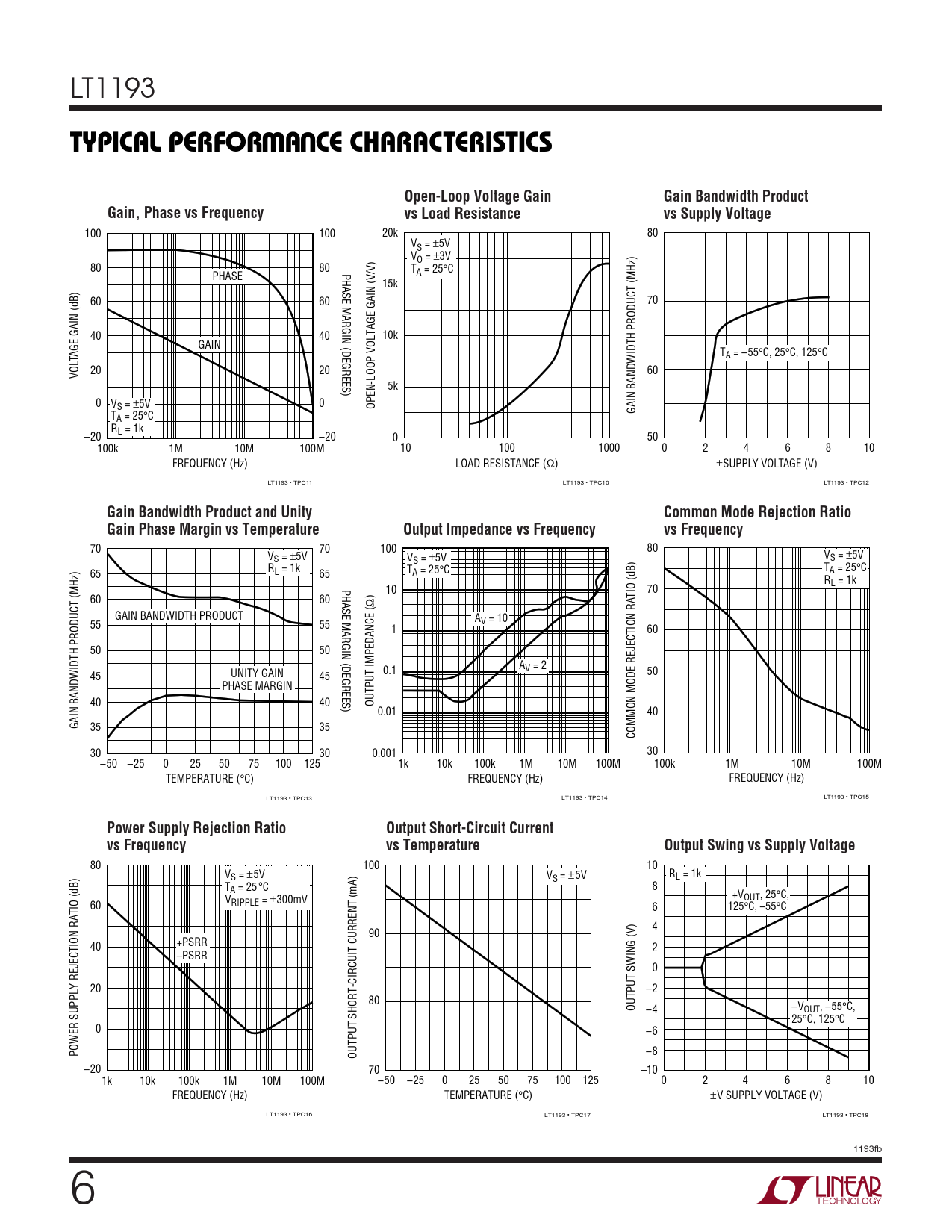 LT1193 WUTYPICAL PERFOR A CE CHARACTERISTICSOpen-Loop Voltage GainGain Bandwidth ProductGain, Phase vs Frequencyvs Load Resistancevs Supply Voltage 100 100 20k 80 VS = ±5V VO = ±3V 80 80 PHASE MARGIN (DEGREES) T PHASE A = 25°C 15k 60 60 70 40 40 10k GAIN T TAGE GAIN (dB) A = –55°C, 25°C, 125°C VOL 20 20 60 5k 0 V 0 S = ±5V OPEN-LOOP VOLTAGE GAIN (V/V) GAIN BANDWIDTH PRODUCT (MHz) TA = 25°C RL = 1k –20 –20 0 50 100k 1M 10M 100M 10 100 1000 0 2 4 6 8 10 FREQUENCY (Hz) LOAD RESISTANCE (Ω) ±SUPPLY VOLTAGE (V) LT1193 • TPC11 LT1193 • TPC10 LT1193 • TPC12 Gain Bandwidth Product and UnityCommon Mode Rejection RatioGain Phase Margin vs TemperatureOutput Impedance vs Frequencyvs Frequency 70 70 100 80 VS = ±5V V V S = ±5V S = ±5V R T 65 L = 1k 65 TA = 25°C A = 25°C R PHASE MARGIN (DEGREES) L = 1k 10 70 TIO (dB) 60 60 Ω GAIN BANDWIDTH PRODUCT A 55 55 V = 10 1 60 50 50 A 0.1 V = 2 50 45 UNITY GAIN 45 PHASE MARGIN 40 40 OUTPUT IMPEDANCE ( ) 0.01 40 GAIN BANDWIDTH PRODUCT (MHz) 35 35 COMMON MODE REJECTION RA 30 30 0.001 30 –50 –25 0 25 50 75 100 125 1k 10k 100k 1M 10M 100M 100k 1M 10M 100M TEMPERATURE (°C) FREQUENCY (Hz) FREQUENCY (Hz) LT1193 • TPC13 LT1193 • TPC14 LT1193 • TPC15 Power Supply Rejection RatioOutput Short-Circuit Currentvs Frequencyvs TemperatureOutput Swing vs Supply Voltage 80 100 10 V V R S = ±5V L = 1k S = ± 5V T ° 8 A = 25 C +VOUT, 25°C, V 60 RIPPLE = ±300mV 6 125°C, –55°C 4 90 40 +PSRR 2 –PSRR 0 20 –2 80 OUTPUT SWING (V) –4 –VOUT, –55°C, 25°C, 125°C 0 –6 POWER SUPPLY REJECTION RATIO (dB) –8 OUTPUT SHORT-CIRCUIT CURRENT (mA) –20 70 –10 1k 10k 100k 1M 10M 100M –50 –25 0 25 50 75 100 125 0 2 4 6 8 10 FREQUENCY (Hz) TEMPERATURE (°C) ±V SUPPLY VOLTAGE (V) LT1193 • TPC16 LT1193 • TPC17 LT1193 • TPC18 1193fb 6