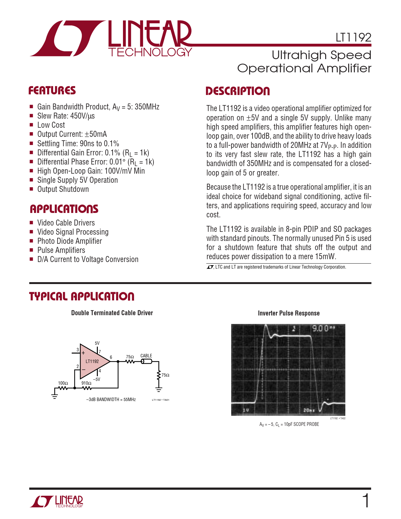 cost. ■ Video Cable Drivers ■ Video Signal Processing The LT1192 is available in 8-pin PDIP and SO packages ■ Photo Diode Amplifier with standard pinouts. The normally unused Pin 5 is used ■ Pulse Amplifiers for a shutdown feature that shuts off the output and ■ D/A Current to Voltage Conversion reduces power dissipation to a mere 15mW. , LTC and LT are registered trademarks of Linear Technology Corporation.