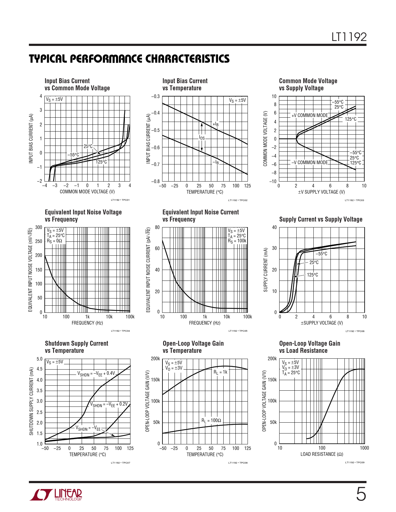5.0 200k 200k VS = ±5V V V S = ±5V S = ±5V 4.5 V V O = ±3V O = ±3V V RL = 1k T SHDN = –VEE + 0.4V A = 25°C 4.0 150k 150k 3.5 3.0 100k 100k VSHDN = –VEE + 0.2V 2.5 R 2.0 50k L = 100Ω 50k VSHDN = –VEE OPEN-LOOP VOLTAGE GAIN (V/V) OPEN-LOOP VOLTAGE GAIN (V/V) SHUTDOWN SUPPLY CURRENT (mA) 1.5 1.0 0 0 –50 –25 0 25 50 75 100 125 –50 –25 0 25 50 75 100 125 10 100 1000 TEMPERATURE (°C) TEMPERATURE (°C) LOAD RESISTANCE (Ω) LT1192 • TPC07 LT1192 • TPC08 LT1192 • TPC09 5