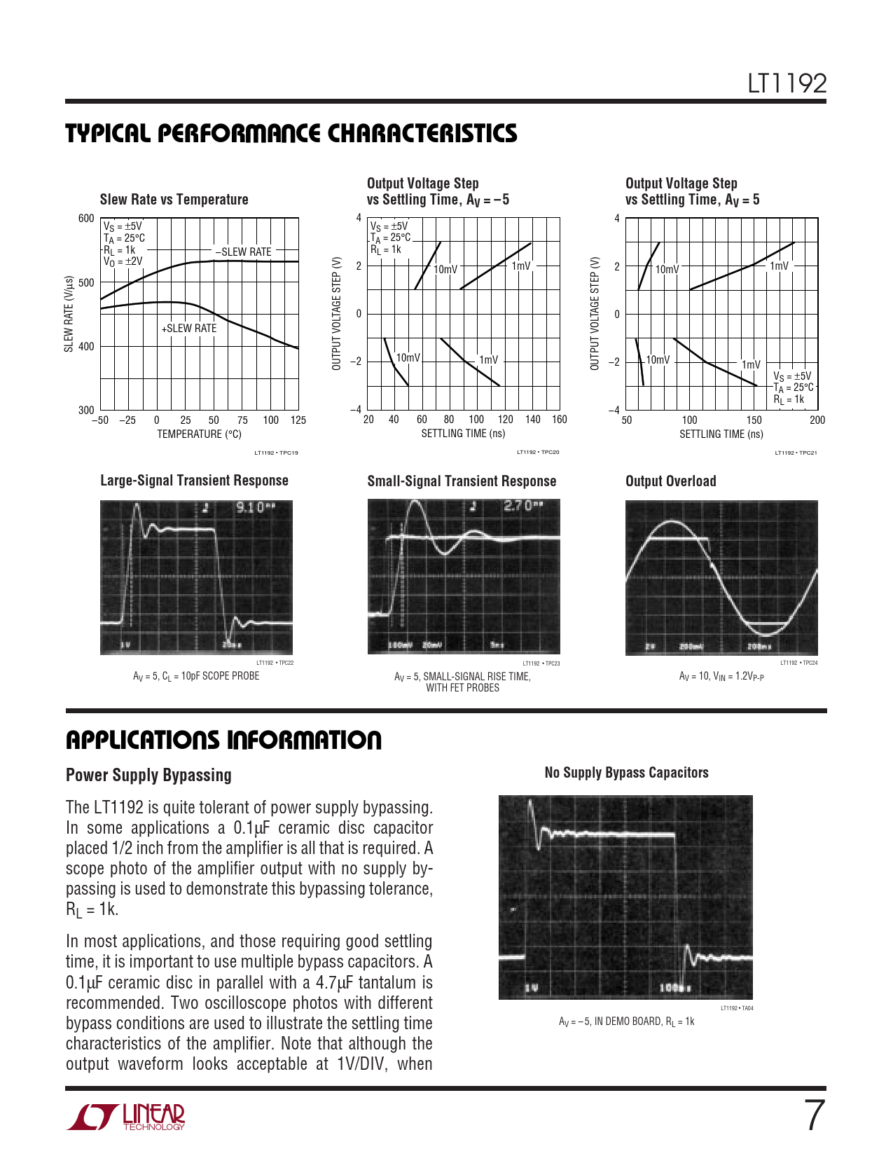 LT1192 WUTYPICAL PERFOR A CE CHARACTERISTICSOutput Voltage StepOutput Voltage StepSlew Rate vs Temperaturevs Settling Time, AV = – 5vs Settling Time, AV = 5 600 4 4 VS = ±5V VS = ±5V TA = 25°C TA = 25°C RL = 1k –SLEW RATE RL = 1k VO = ±2V 2 1mV 10mV 2 1mV 10mV µs) 500 TE (V/ TAGE STEP (V) 0 TAGE STEP (V) 0 +SLEW RATE SLEW RA 400 –2 10mV 1mV –2 10mV OUTPUT VOL OUTPUT VOL 1mV VS = ±5V TA = 25°C RL = 1k 300 –4 –4 –50 –25 0 25 50 75 100 125 20 40 60 80 100 120 140 160 50 100 150 200 TEMPERATURE (°C) SETTLING TIME (ns) SETTLING TIME (ns) LT1192 • TPC19 LT1192 • TPC20 LT1192 • TPC21 Large-Signal Transient ResponseSmall-Signal Transient ResponseOutput Overload LT1192 • TPC22 LT1192 • TPC23 LT1192 • TPC24 AV = 5, CL = 10pF SCOPE PROBE A A V = 5, SMALL-SIGNAL RISE TIME, V = 10, VIN = 1.2VP-P WITH FET PROBES UUWUAPPLICATIO S I FOR ATIOPower Supply BypassingNo Supply Bypass Capacitors The LT1192 is quite tolerant of power supply bypassing. In some applications a 0.1µF ceramic disc capacitor placed 1/2 inch from the amplifier is all that is required. A scope photo of the amplifier output with no supply by- passing is used to demonstrate this bypassing tolerance, RL = 1k. In most applications, and those requiring good settling time, it is important to use multiple bypass capacitors. A 0.1µF ceramic disc in parallel with a 4.7µF tantalum is recommended. Two oscilloscope photos with different LT1192 • TA04 bypass conditions are used to illustrate the settling time AV = – 5, IN DEMO BOARD, RL = 1k characteristics of the amplifier. Note that although the output waveform looks acceptable at 1V/DIV, when 7