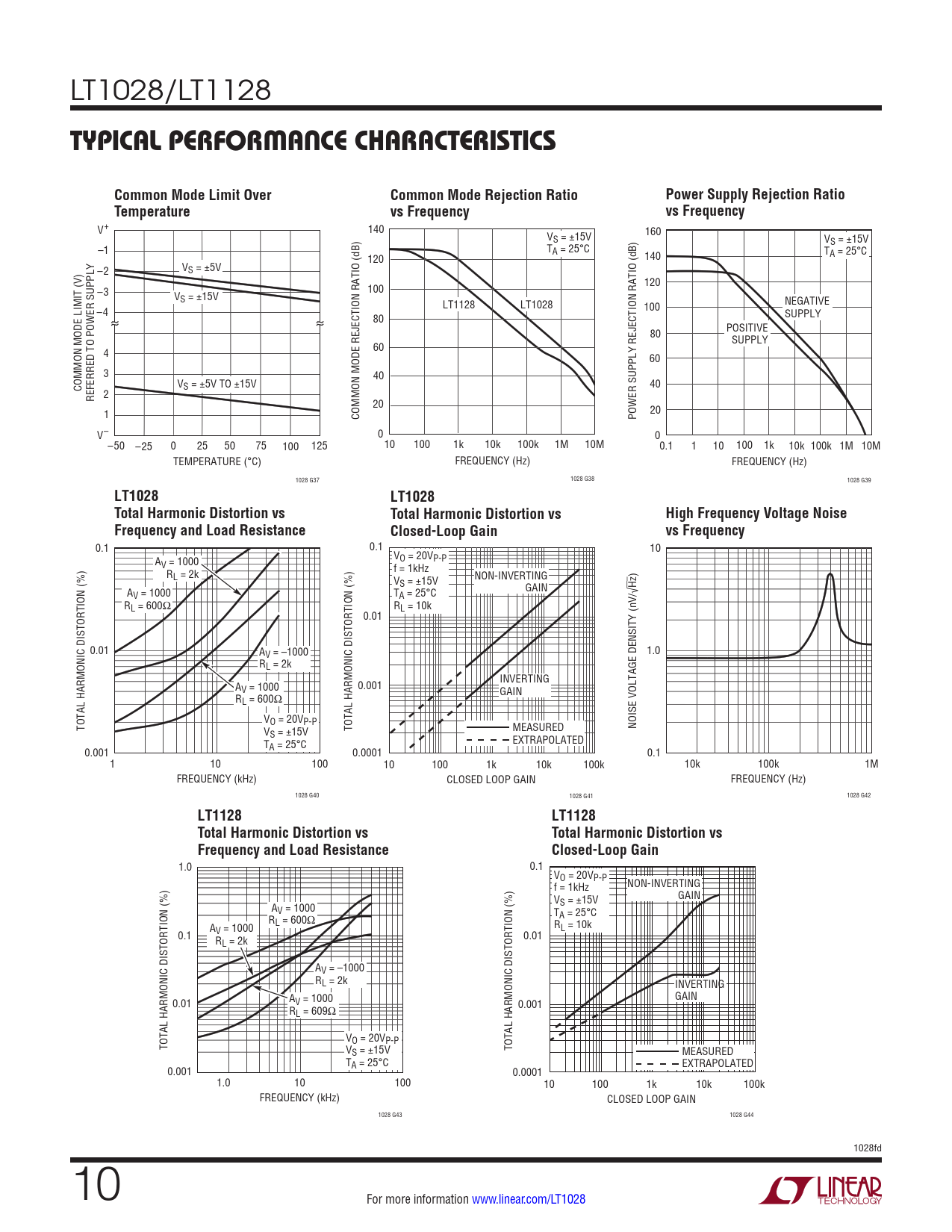 LT1028/LT1128 TYPICAL PERFORMANCE CHARACTERISTICSCommon Mode Limit OverCommon Mode Rejection RatioPower Supply Rejection RatioTemperaturevs Frequencyvs Frequency V+ 140 V 160 S = ±15V VS = ±15V –1 TA = 25°C T 120 140 A = 25°C –2 VS = ±5V 120 –3 100 VS = ±15V LT1128 LT1028 NEGATIVE –4 100 80 SUPPLY 80 POSITIVE SUPPLY 4 60 60 3 40 COMMON MODE LIMIT (V) VS = ±5V TO ±15V 40 REFERRED TO POWER SUPPLY 2 20 1 COMMON MODE REJECTION RATIO (dB) POWER SUPPLY REJECTION RATIO (dB) 20 V– 0 0 –50 –25 0 25 50 75 100 125 10 100 1k 10k 100k 1M 10M 0.1 1 10 100 1k 10k 100k 1M 10M TEMPERATURE (°C) FREQUENCY (Hz) FREQUENCY (Hz) 1028 G37 1028 G38 1028 G39 LT1028LT1028Total Harmonic Distortion vsTotal Harmonic Distortion vsHigh Frequency Voltage NoiseFrequency and Load ResistanceClosed-Loop Gainvs Frequency 0.1 0.1 10 A VO = 20VP-P V = 1000 R f = 1kHz L = 2k ) V NON-INVERTING S = ±15V Hz A GAIN V = 1000 TA = 25°C RL = 600Ω RL = 10k 0.01 0.01 AV = –1000 1.0 RL = 2k INVERTING AV = 1000 0.001 GAIN RL = 600Ω V TOTAL HARMONIC DISTORTION (%) O = 20VP-P NOISE VOLTAGE DENSITY (nV/√ V TOTAL HARMONIC DISTORTION (%) MEASURED S = ±15V T EXTRAPOLATED 0.001 A = 25°C 0.0001 0.1 1 10 100 10 100 1k 10k 100k 10k 100k 1M FREQUENCY (kHz) CLOSED LOOP GAIN FREQUENCY (Hz) 1028 G40 1028 G41 1028 G42 LT1128LT1128Total Harmonic Distortion vsTotal Harmonic Distortion vsFrequency and Load ResistanceClosed-Loop Gain 1.0 0.1 VO = 20VP-P f = 1kHz NON-INVERTING V GAIN A S = ±15V V = 1000 T R A = 25°C L = 600Ω A RL = 10k 0.1 V = 1000 R 0.01 L = 2k AV = –1000 RL = 2k INVERTING GAIN 0.01 AV = 1000 R 0.001 L = 609Ω V TOTAL HARMONIC DISTORTION (%) O = 20VP-P V TOTAL HARMONIC DISTORTION (%) S = ±15V MEASURED T EXTRAPOLATED 0.001 A = 25°C 0.0001 1.0 10 100 10 100 1k 10k 100k FREQUENCY (kHz) CLOSED LOOP GAIN 1028 G43 1028 G44 1028fd 10 For more information www.linear.com/LT1028 Document Outline Features Applications Description Typical Application Absolute Maximum Ratings Pin Configuration Order Information Electrical Characteristics Typical Performance Characteristics Applications Information - Noise Applications Information Typical Applications Schematic Diagram Package Description Revision History Typical Application Related Parts