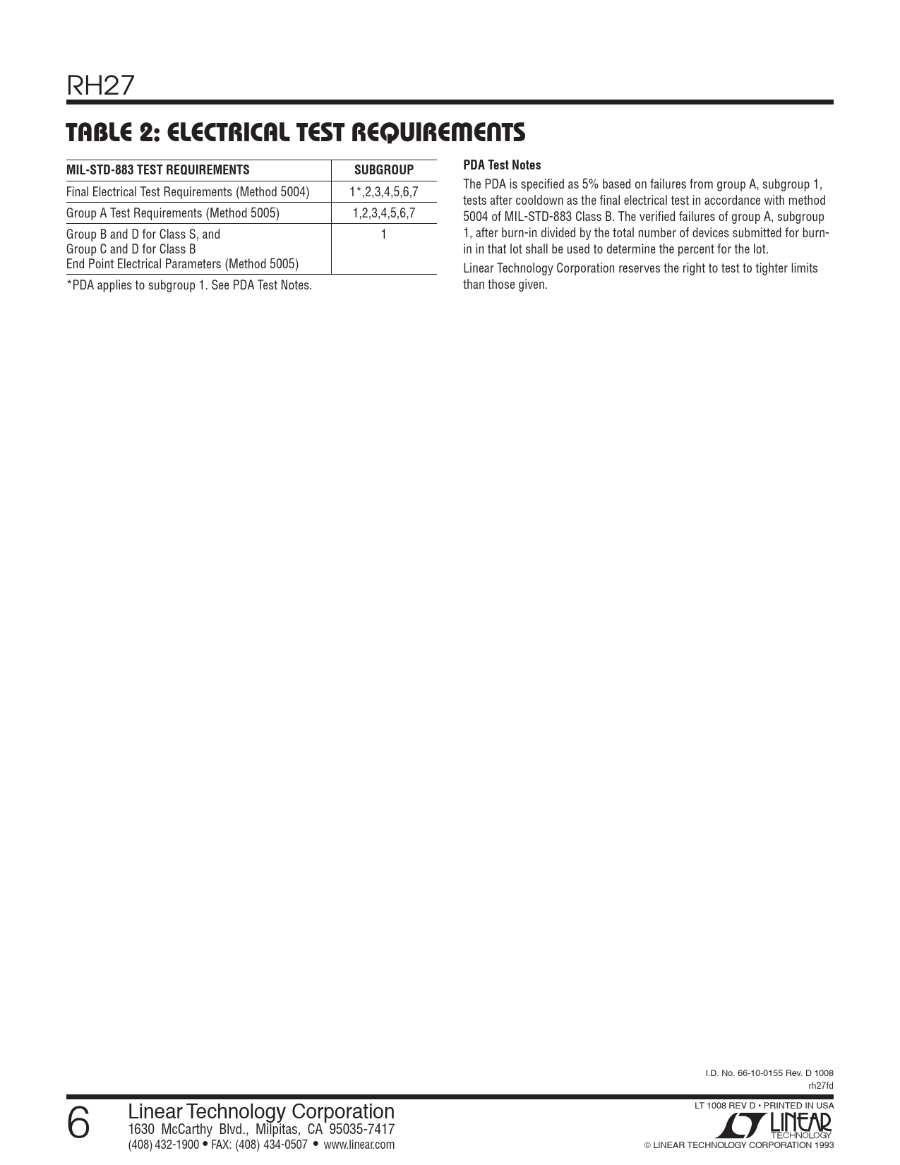 | Pages / Page | 6 / 6 — TABLE 2: ELECTRICAL TEST REQUIREMENTS. PDA Test Notes. MIL-STD-883 TEST … |