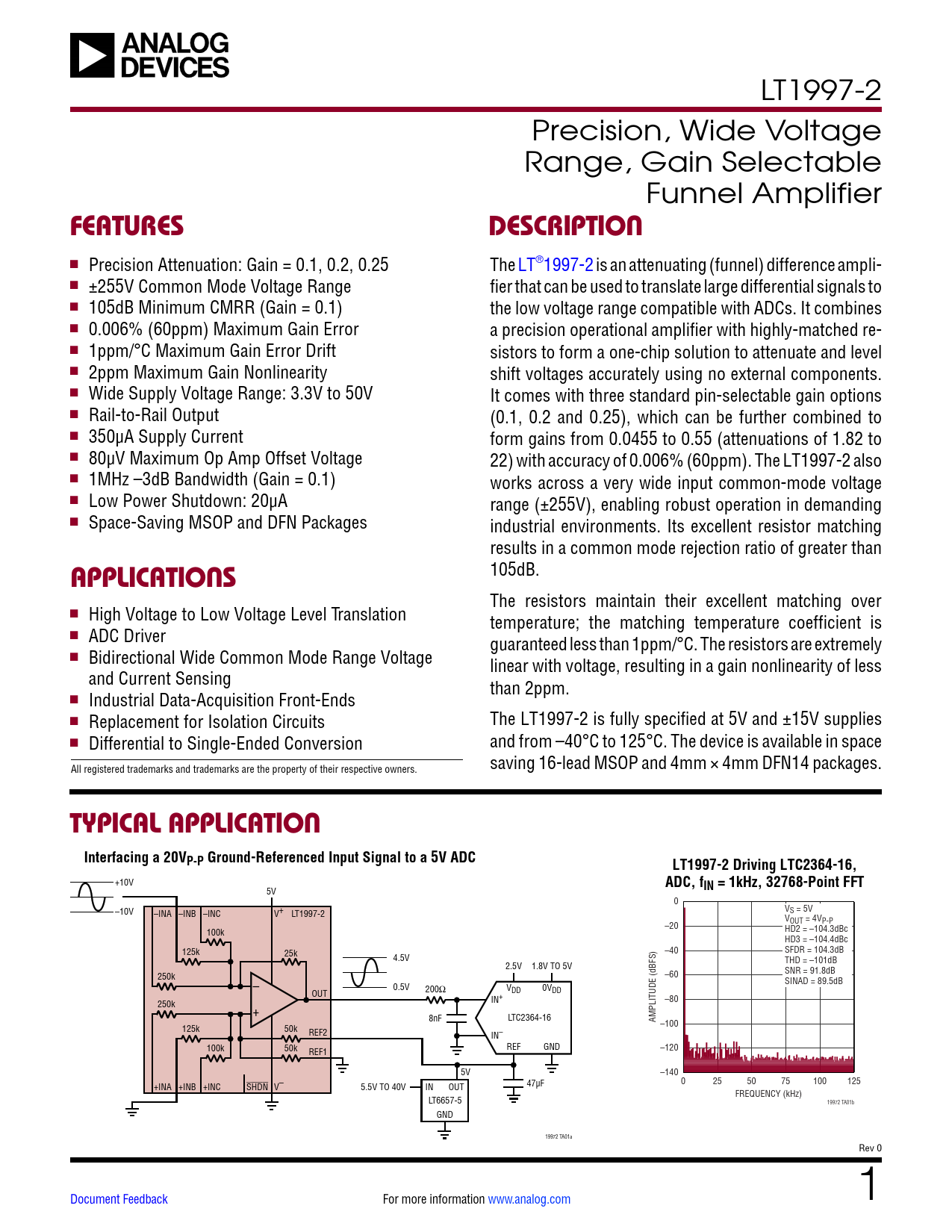 FEATURES. DESCRIPTION. APPLICATIONS. TYPICAL APPLICATION. Interfacing a 20VP-P Ground-Referenced Input Signal to a 5V ADC