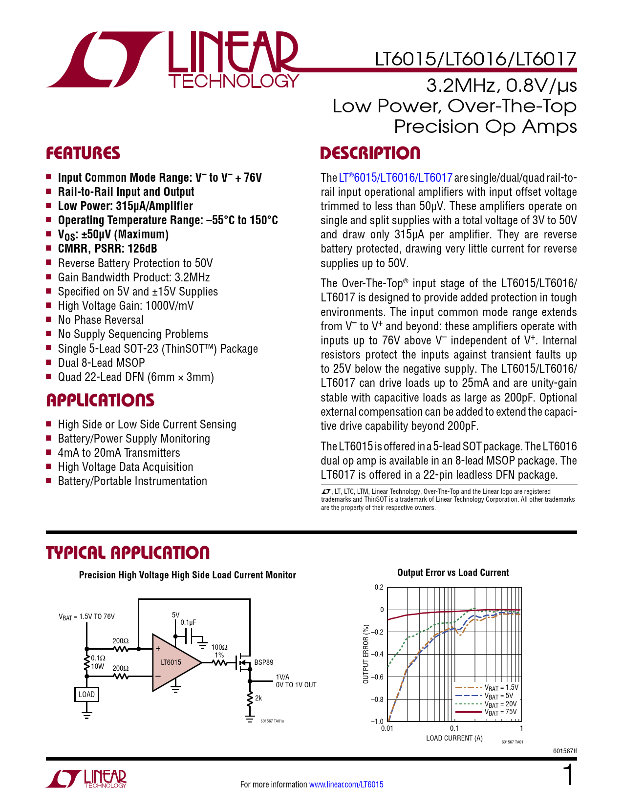stable with capacitive loads as large as 200pF. Optional external compensation can be added to extend the capaci- n High Side or Low Side Current Sensing tive drive capability beyond 200pF. n Battery/Power Supply Monitoring The LT6015 is offered in a 5-lead SOT package. The LT6016 n 4mA to 20mA Transmitters dual op amp is available in an 8-lead MSOP package. The n High Voltage Data Acquisition LT6017 is offered in a 22-pin leadless DFN package. n Battery/Portable Instrumentation L, LT, LTC, LTM, Linear Technology, Over-The-Top and the Linear logo are registered trademarks and ThinSOT is a trademark of Linear Technology Corporation. All other trademarks are the property of their respective owners.