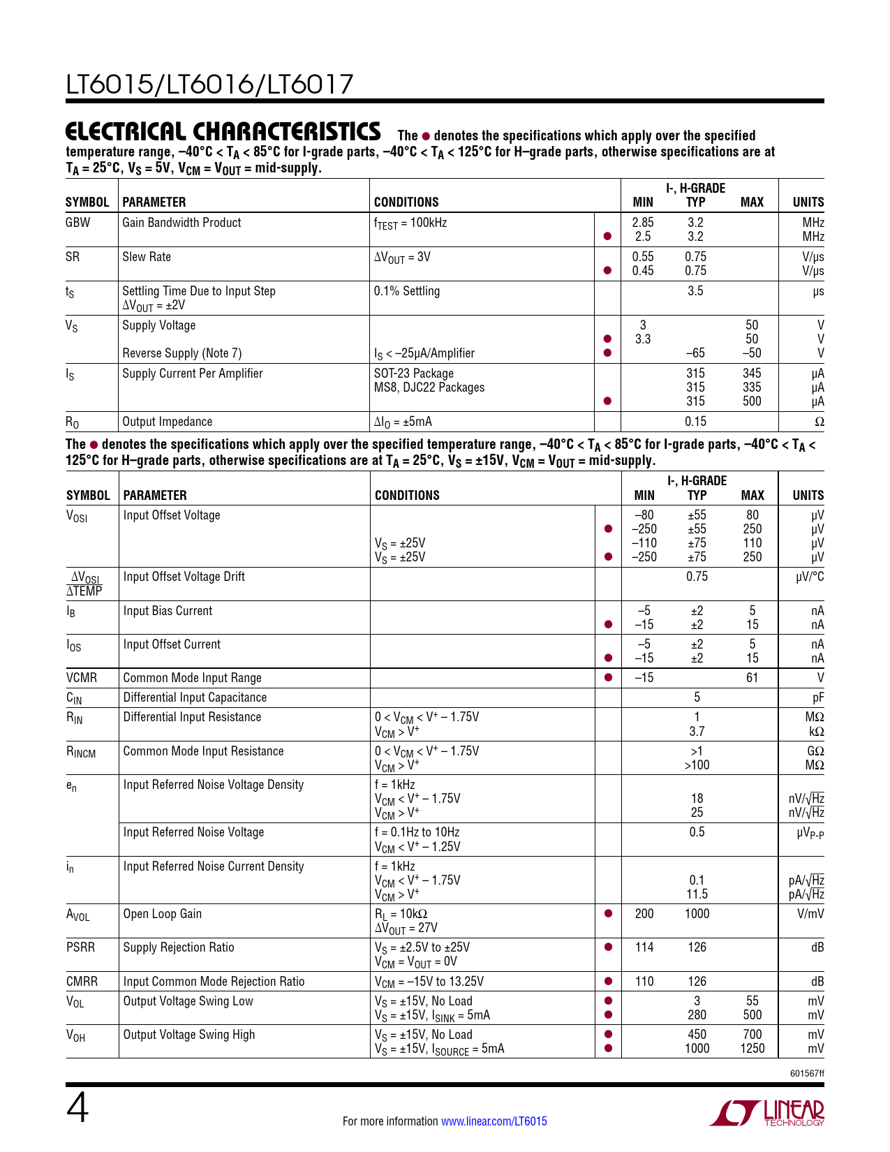 LT6015/LT6016/LT6017 e lecTrical characTerisTics The l denotes the specifications which apply over the specifiedtemperature range, –40°C < TA < 85°C for I-grade parts, –40°C < TA < 125°C for H–grade parts, otherwise specifications are atTA = 25°C, VS = 5V, VCM = VOUT = mid-supply.I-, H-GRADESYMBOL PARAMETERCONDITIONSMINTYPMAXUNITS GBW Gain Bandwidth Product fTEST = 100kHz 2.85 3.2 MHz l 2.5 3.2 MHz SR Slew Rate ∆VOUT = 3V 0.55 0.75 V/µs l 0.45 0.75 V/µs tS Settling Time Due to Input Step 0.1% Settling 3.5 µs ∆VOUT = ±2V VS Supply Voltage 3 50 V l 3.3 50 V Reverse Supply (Note 7) IS < –25µA/Amplifier l –65 –50 V IS Supply Current Per Amplifier SOT-23 Package 315 345 µA MS8, DJC22 Packages 315 335 µA l 315 500 µA RO Output Impedance ∆IO = ±5mA 0.15 Ω The l denotes the specifications which apply over the specified temperature range, –40°C < TA < 85°C for I-grade parts, –40°C < TA <125°C for H–grade parts, otherwise specifications are at TA = 25°C, VS = ±15V, VCM = VOUT = mid-supply.I-, H-GRADESYMBOL PARAMETERCONDITIONSMINTYPMAXUNITS VOSI Input Offset Voltage –80 ±55 80 µV l –250 ±55 250 µV VS = ±25V –110 ±75 110 µV VS = ±25V l –250 ±75 250 µV ∆VOSI Input Offset Voltage Drift 0.75 µV/°C ∆TEMP IB Input Bias Current –5 ±2 5 nA l –15 ±2 15 nA IOS Input Offset Current –5 ±2 5 nA l –15 ±2 15 nA VCMR Common Mode Input Range l –15 61 V CIN Differential Input Capacitance 5 pF RIN Differential Input Resistance 0 < VCM < V+ – 1.75V 1 MΩ VCM > V+ 3.7 kΩ RINCM Common Mode Input Resistance 0 < VCM < V+ – 1.75V >1 GΩ VCM > V+ >100 MΩ en Input Referred Noise Voltage Density f = 1kHz VCM < V+ – 1.75V 18 nV/√Hz VCM > V+ 25 nV/√Hz Input Referred Noise Voltage f = 0.1Hz to 10Hz 0.5 µVP-P VCM < V+ – 1.25V in Input Referred Noise Current Density f = 1kHz VCM < V+ – 1.75V 0.1 pA/√Hz VCM > V+ 11.5 pA/√Hz AVOL Open Loop Gain RL = 10kΩ l 200 1000 V/mV ∆VOUT = 27V PSRR Supply Rejection Ratio VS = ±2.5V to ±25V l 114 126 dB VCM = VOUT = 0V CMRR Input Common Mode Rejection Ratio VCM = –15V to 13.25V l 110 126 dB VOL Output Voltage Swing Low VS = ±15V, No Load l 3 55 mV VS = ±15V, ISINK = 5mA l 280 500 mV VOH Output Voltage Swing High VS = ±15V, No Load l 450 700 mV VS = ±15V, ISOURCE = 5mA l 1000 1250 mV 601567ff 4 For more information www.linear.com/LT6015 Document Outline Features Applications Description Typical Application Absolute Maximum Ratings Pin Configuration Order Information Electrical Characteristics Typical Performance Characteristics Applications Information Simplified Schematic Typical Applications Package Description Revision History Related Parts