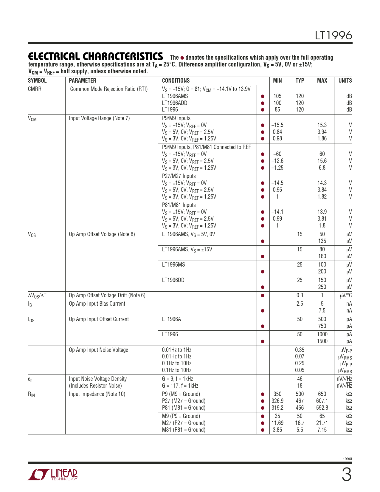 CMRR Common Mode Rejection Ratio (RTI) VS = ±15V; G = 81; VCM = –14.1V to 13.9V LT1996AMS ● 105 120 dB LT1996ADD ● 100 120 dB LT1996 ● 85 120 dB VCM Input Voltage Range (Note 7) P9/M9 Inputs VS = ±15V; VREF = 0V ● –15.5 15.3 V VS = 5V, 0V; VREF = 2.5V ● 0.84 3.94 V VS = 3V, 0V; VREF = 1.25V ● 0.98 1.86 V P9/M9 Inputs, P81/M81 Connected to REF VS = ±15V; VREF = 0V ● –60 60 V VS = 5V, 0V; VREF = 2.5V ● –12.6 15.6 V VS = 3V, 0V; VREF = 1.25V ● –1.25 6.8 V P27/M27 Inputs VS = ±15V; VREF = 0V ● –14.5 14.3 V VS = 5V, 0V; VREF = 2.5V ● 0.95 3.84 V VS = 3V, 0V; VREF = 1.25V ● 1 1.82 V P81/M81 Inputs VS = ±15V; VREF = 0V ● –14.1 13.9 V VS = 5V, 0V; VREF = 2.5V ● 0.99 3.81 V VS = 3V, 0V; VREF = 1.25V ● 1 1.8 V VOS Op Amp Offset Voltage (Note 8) LT1996AMS, VS = 5V, 0V 15 50 µV ● 135 µV LT1996AMS, VS = ±15V 15 80 µV ● 160 µV LT1996MS 25 100 µV ● 200 µV LT1996DD 25 150 µV ● 250 µV ∆VOS/∆T Op Amp Offset Voltage Drift (Note 6) ● 0.3 1 µV/°C IB Op Amp Input Bias Current 2.5 5 nA ● 7.5 nA IOS Op Amp Input Offset Current LT1996A 50 500 pA ● 750 pA LT1996 50 1000 pA ● 1500 pA Op Amp Input Noise Voltage 0.01Hz to 1Hz 0.35 µVP-P 0.01Hz to 1Hz 0.07 µVRMS 0.1Hz to 10Hz 0.25 µVP-P 0.1Hz to 10Hz 0.05 µVRMS en Input Noise Voltage Density G = 9; f = 1kHz 46 nV/√Hz (Includes Resistor Noise) G = 117; f = 1kHz 18 nV/√Hz RIN Input Impedance (Note 10) P9 (M9 = Ground) ● 350 500 650 kΩ P27 (M27 = Ground) ● 326.9 467 607.1 kΩ P81 (M81 = Ground) ● 319.2 456 592.8 kΩ M9 (P9 = Ground) ● 35 50 65 kΩ M27 (P27 = Ground) ● 11.69 16.7 21.71 kΩ M81 (P81 = Ground) ● 3.85 5.5 7.15 kΩ 1996f 3