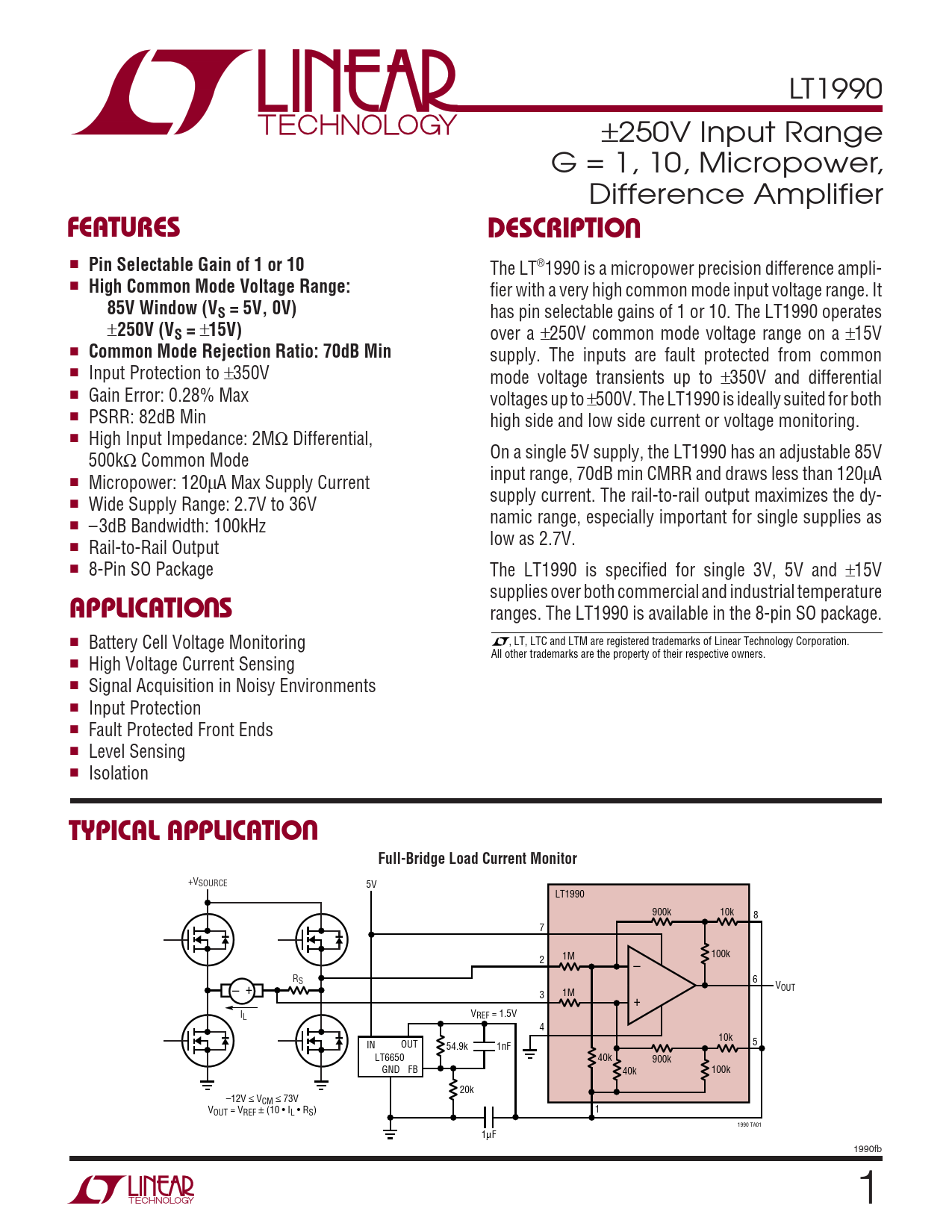 ranges. The LT1990 is available in the 8-pin SO package. ■ Battery Cell Voltage Monitoring , LT, LTC and LTM are registered trademarks of Linear Technology Corporation. All other trademarks are the property of their respective owners. ■ High Voltage Current Sensing ■ Signal Acquisition in Noisy Environments ■ Input Protection ■ Fault Protected Front Ends ■ Level Sensing ■ Isolation
