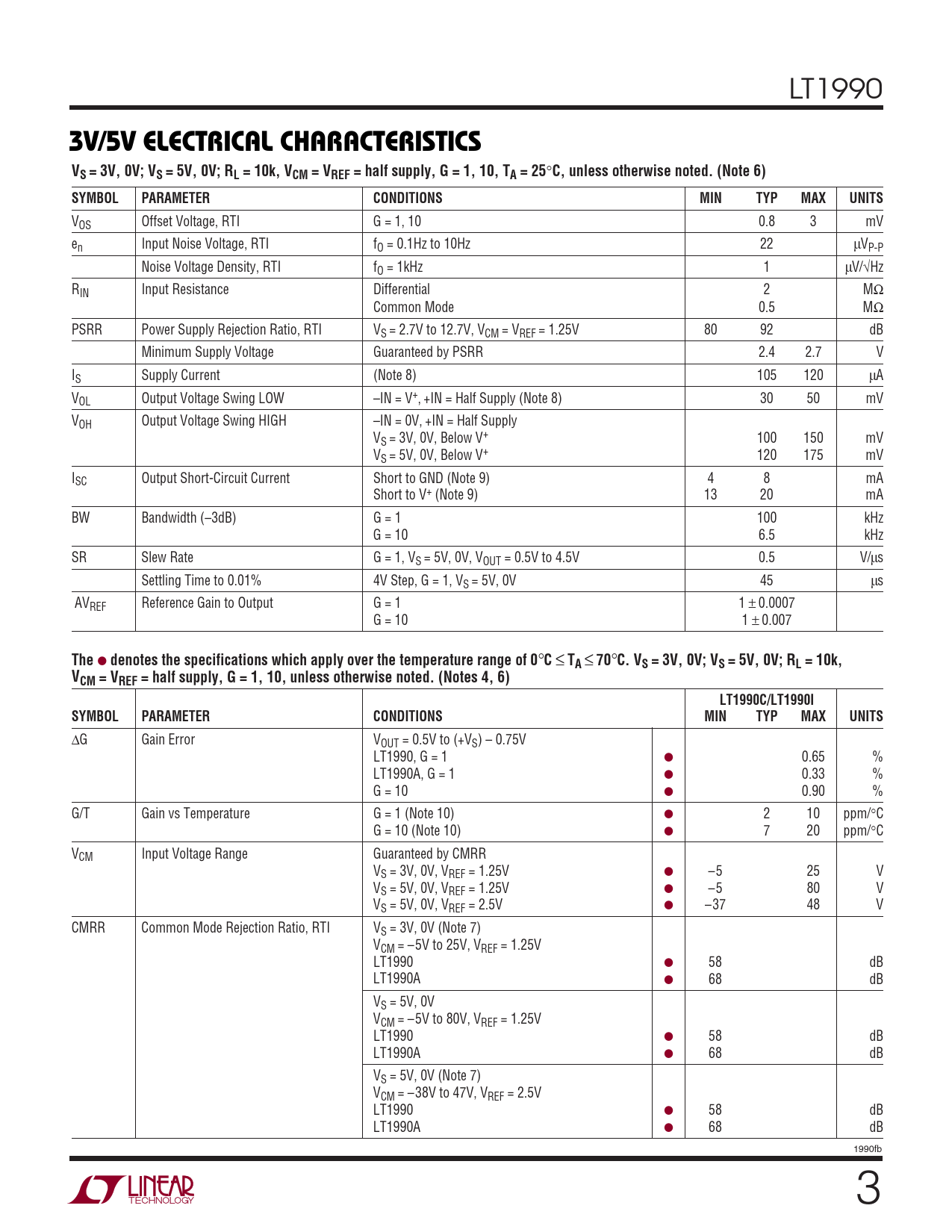 C. VS = 3V, 0V; VS = 5V, 0V; RL = 10k, VCM = VREF = half supply, G = 1, 10, unless otherwise noted. (Notes 4, 6) LT1990C/LT1990I SYMBOL PARAMETER CONDITIONS MIN TYP MAX UNITS