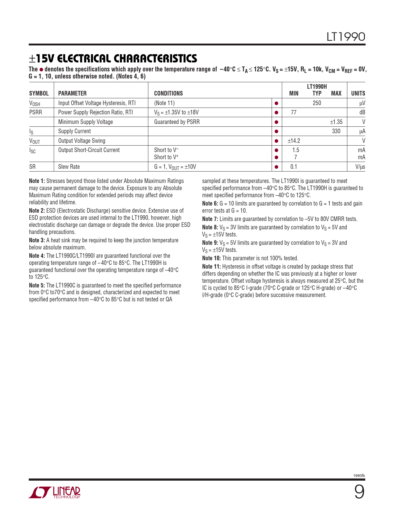 15V, RL = 10k, VCM = VREF = 0V, G = 1, 10, unless otherwise noted. (Notes 4, 6) LT1990H SYMBOL PARAMETER CONDITIONS MIN TYP MAX UNITS