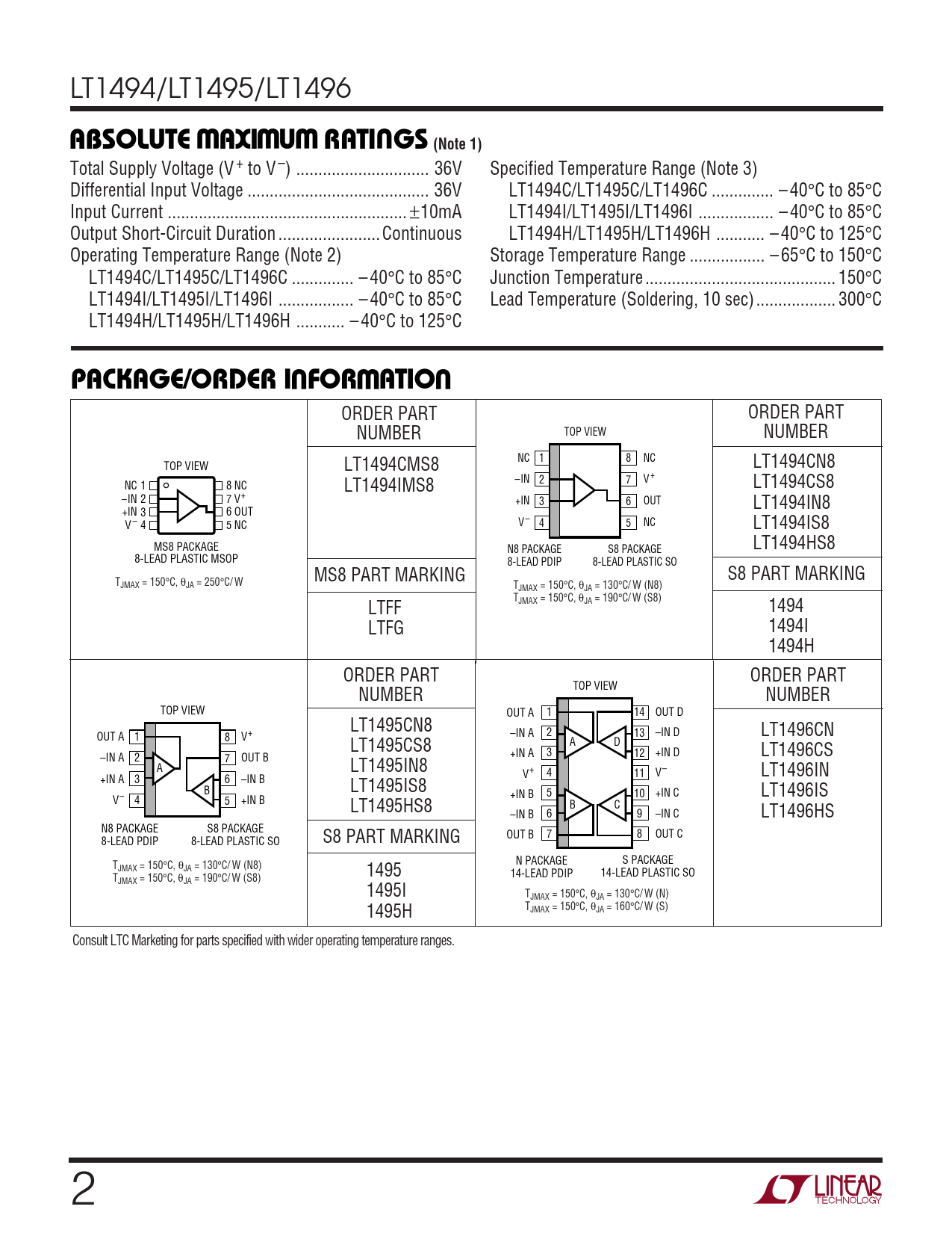 ORDER PART ORDER PART NUMBER TOP VIEW NUMBER TOP VIEW LT1494CMS8 NC 1 8 NC LT1494CN8 NC 1 8 NC LT1494IMS8 –IN 2 7 V + LT1494CS8 –IN 2 7 V+ +IN 3 6 OUT LT1494IN8 +IN 3 6 OUT V – 4 5 NC V – 4 5 NC LT1494IS8 MS8 PACKAGE LT1494HS8 N8 PACKAGE S8 PACKAGE 8-LEAD PLASTIC MSOP 8-LEAD PDIP 8-LEAD PLASTIC SO MS8 PART MARKING S8 PART MARKING TJMAX = 150°C, θJA = 250°C/ W TJMAX = 150°C, θJA = 130°C/ W (N8) T LTFF JMAX = 150°C, θJA = 190°C/ W (S8) 1494 LTFG 1494I 1494H ORDER PART ORDER PART TOP VIEW NUMBER NUMBER TOP VIEW OUT A 1 14 OUT D LT1495CN8 –IN A 2 13 –IN D LT1496CN OUT A 1 8 V+ LT1495CS8 A D +IN A 3 12 +IN D LT1496CS –IN A 2 7 OUT B A LT1495IN8 V+ 4 11 V– LT1496IN +IN A 3 6 –IN B B LT1495IS8 +IN B 5 10 +IN C LT1496IS V– 4 5 +IN B LT1495HS8 B C –IN B 6 9 –IN C LT1496HS N8 PACKAGE S8 PACKAGE OUT B 7 8 OUT C 8-LEAD PDIP 8-LEAD PLASTIC SO S8 PART MARKING T N PACKAGE S PACKAGE JMAX = 150°C, θJA = 130°C/ W (N8) 1495 T 14-LEAD PDIP 14-LEAD PLASTIC SO JMAX = 150°C, θJA = 190°C/ W (S8) 1495I TJMAX = 150°C, θJA = 130°C/ W (N) TJMAX = 150°C, θJA = 160°C/ W (S) 1495H Consult LTC Marketing for parts specified with wider operating temperature ranges. 2