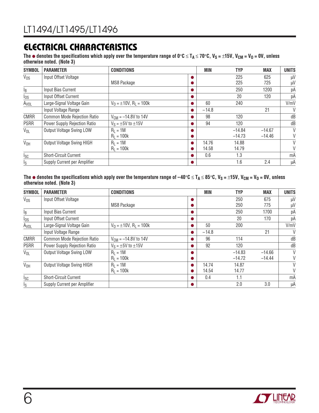 VOS Input Offset Voltage ● 250 675 µV MS8 Package ● 250 775 µV IB Input Bias Current ● 250 1700 pA IOS Input Offset Current ● 20 170 pA AVOL Large-Signal Voltage Gain VO = ±10V, RL = 100k ● 50 200 V/mV Input Voltage Range ● – 14.8 21 V CMRR Common Mode Rejection Ratio VCM = –14.8V to 14V ● 96 114 dB PSRR Power Supply Rejection Ratio VS = ±5V to ±15V ● 92 120 dB VOL Output Voltage Swing LOW RL = 1M ● –14.83 –14.66 V RL = 100k ● –14.72 –14.44 V VOH Output Voltage Swing HIGH RL = 1M ● 14.74 14.87 V RL = 100k ● 14.54 14.77 V ISC Short-Circuit Current ● 0.4 1.1 mA IS Supply Current per Amplifier ● 2.0 3.0 µA 6