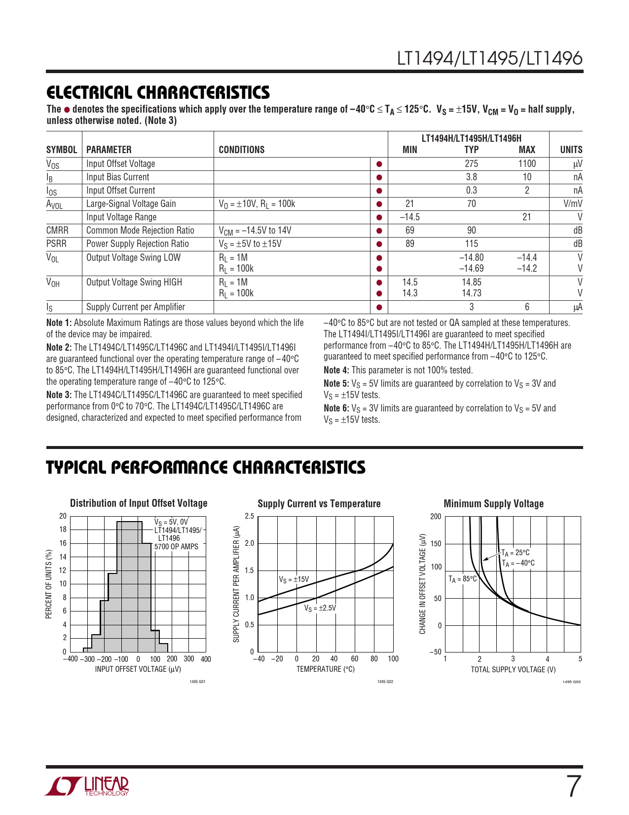 LT1494/LT1495/LT1496 ELECTRICAL CHARACTERISTICSThe ● denotes the specifications which apply over the temperature range of –40 ° C ≤ TA ≤ 125 ° C. VS = ± 15V, VCM = VO = half supply,unless otherwise noted. (Note 3)LT1494H/LT1495H/LT1496HSYMBOLPARAMETERCONDITIONSMINTYPMAXUNITS VOS Input Offset Voltage ● 275 1100 µV IB Input Bias Current ● 3.8 10 nA IOS Input Offset Current ● 0.3 2 nA AVOL Large-Signal Voltage Gain VO = ±10V, RL = 100k ● 21 70 V/mV Input Voltage Range ● –14.5 21 V CMRR Common Mode Rejection Ratio VCM = –14.5V to 14V ● 69 90 dB PSRR Power Supply Rejection Ratio VS = ±5V to ±15V ● 89 115 dB VOL Output Voltage Swing LOW RL = 1M ● –14.80 –14.4 V RL = 100k ● –14.69 –14.2 V VOH Output Voltage Swing HIGH RL = 1M ● 14.5 14.85 V RL = 100k ● 14.3 14.73 V IS Supply Current per Amplifier ● 3 6 µA Note 1: Absolute Maximum Ratings are those values beyond which the life –40°C to 85°C but are not tested or QA sampled at these temperatures. of the device may be impaired. The LT1494I/LT1495I/LT1496I are guaranteed to meet specified performance from –40 Note 2: The LT1494C/LT1495C/LT1496C and LT1494I/LT1495I/LT1496I °C to 85°C. The LT1494H/LT1495H/LT1496H are guaranteed to meet specified performance from –40 are guaranteed functional over the operating temperature range of – 40°C °C to 125°C. to 85°C. The LT1494H/LT1495H/LT1496H are guaranteed functional over Note 4: This parameter is not 100% tested. the operating temperature range of –40°C to 125°C. Note 5: VS = 5V limits are guaranteed by correlation to VS = 3V and Note 3: The LT1494C/LT1495C/LT1496C are guaranteed to meet specified VS = ±15V tests. performance from 0°C to 70°C. The LT1494C/LT1495C/LT1496C are Note 6: VS = 3V limits are guaranteed by correlation to VS = 5V and designed, characterized and expected to meet specified performance from VS = ±15V tests. WUTYPICAL PERFORMANCE CHARACTERISTICSDistribution of Input Offset VoltageSupply Current vs TemperatureMinimum Supply Voltage 20 2.5 200 VS = 5V, 0V 18 LT1494/LT1495/ µA) LT1496 16 2.0 µV) 5700 OP AMPS 150 T 14 A = 25°C T 100 A = – 40°C 12 1.5 V T S = ±15V A = 85°C 10 8 1.0 50 6 VS = ±2.5V PERCENT OF UNITS (%) 4 0.5 0 CHANGE IN OFFSET VOLTAGE ( 2 SUPPLY CURRENT PER AMPLIFIER ( 0 0 – 50 –400 –300 –200 –100 0 100 200 300 400 – 40 – 20 0 20 40 60 80 100 1 2 3 4 5 INPUT OFFSET VOLTAGE (µV) TEMPERATURE (°C) TOTAL SUPPLY VOLTAGE (V) 1495 G01 1495 G02 1495 G03 7
