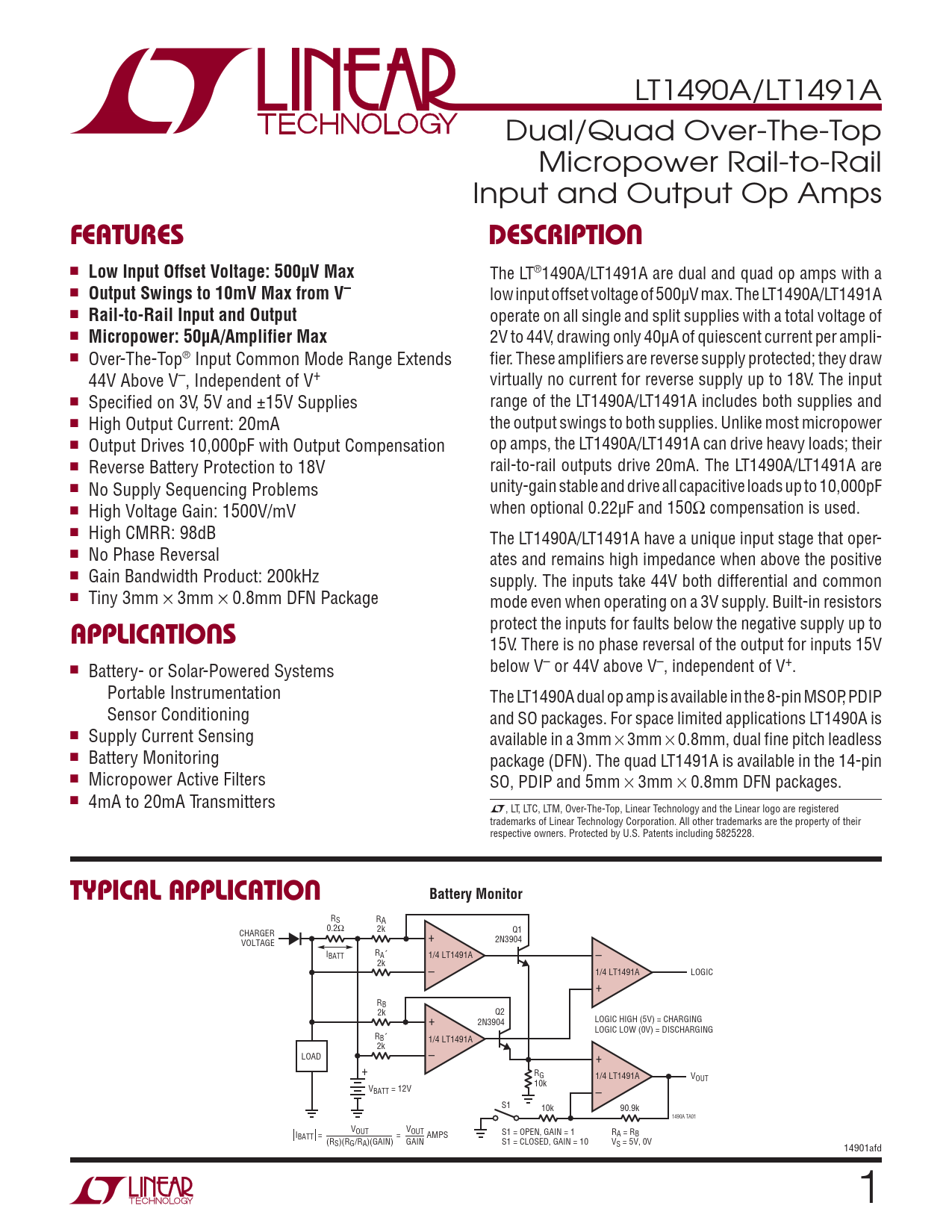 LT1490A/LT1491A Dual/Quad Over-The-Top Micropower Rail-to-Rail Input and Output Op Amps FEATURESDESCRIPTION n Low Input Offset Voltage: 500μV Max The LT®1490A/LT1491A are dual and quad op amps with a n Output Swings to 10mV Max from V– low input offset voltage of 500μV max. The LT1490A/LT1491A n Rail-to-Rail Input and Output operate on all single and split supplies with a total voltage of n Micropower: 50μA/Amplifier Max 2V to 44V, drawing only 40μA of quiescent current per ampli- n Over-The-Top® Input Common Mode Range Extends fier. These amplifiers are reverse supply protected; they draw 44V Above V–, Independent of V+ virtually no current for reverse supply up to 18V. The input n Specified on 3V, 5V and ±15V Supplies range of the LT1490A/LT1491A includes both supplies and n High Output Current: 20mA the output swings to both supplies. Unlike most micropower n Output Drives 10,000pF with Output Compensation op amps, the LT1490A/LT1491A can drive heavy loads; their n Reverse Battery Protection to 18V rail-to-rail outputs drive 20mA. The LT1490A/LT1491A are n No Supply Sequencing Problems unity-gain stable and drive all capacitive loads up to 10,000pF n when optional 0.22μF and 150Ω compensation is used. High Voltage Gain: 1500V/mV n High CMRR: 98dB The LT1490A/LT1491A have a unique input stage that oper- n No Phase Reversal ates and remains high impedance when above the positive n Gain Bandwidth Product: 200kHz supply. The inputs take 44V both differential and common n Tiny 3mm × 3mm × 0.8mm DFN Package mode even when operating on a 3V supply. Built-in resistors protect the inputs for faults below the negative supply up to APPLICATIONS 15V. There is no phase reversal of the output for inputs 15V n below V– or 44V above V–, independent of V+. Battery- or Solar-Powered Systems Portable Instrumentation The LT1490A dual op amp is available in the 8-pin MSOP, PDIP Sensor Conditioning and SO packages. For space limited applications LT1490A is n Supply Current Sensing available in a 3mm × 3mm × 0.8mm, dual fine pitch leadless n Battery Monitoring package (DFN). The quad LT1491A is available in the 14-pin n Micropower Active Filters SO, PDIP and 5mm × 3mm × 0.8mm DFN packages. n 4mA to 20mA Transmitters L, LT, LTC, LTM, Over-The-Top, Linear Technology and the Linear logo are registered trademarks of Linear Technology Corporation. All other trademarks are the property of their respective owners. Protected by U.S. Patents including 5825228. TYPICAL APPLICATIONBattery Monitor RS RA 0.2Ω 2k Q1 CHARGER + 2N3904 VOLTAGE I R BATT A´ 1/4 LT1491A – 2k – 1/4 LT1491A LOGIC + RB 2k Q2 + 2N3904 LOGIC HIGH (5V) = CHARGING LOGIC LOW (0V) = DISCHARGING RB´ 1/4 LT1491A 2k LOAD – + + RG 1/4 LT1491A VOUT 10k VBATT = 12V – S1 10k 90.9k 1490A TA01 VOUT VOUT S1 = OPEN, GAIN = 1 R I A = RB BATT = = AMPS (R GAIN S1 = CLOSED, GAIN = 10 V S)(RG/RA)(GAIN) S = 5V, 0V 14901afd 1 Document Outline FEATURES DESCRIPTION APPLICATIONS TYPICAL APPLICATION ABSOLUTE MAXIMUM RATINGS PIN CONFIGURATION ORDER INFORMATION ELECTRICAL CHARACTERISTICS TYPICAL PERFORMANCE CHARACTERISTICS APPLICATIONS INFORMATION TYPICAL APPLICATIONS SIMPLIFIED SCHEMATIC PACKAGE DESCRIPTION REVISION HISTORY TYPICAL APPLICATION RELATED PARTS