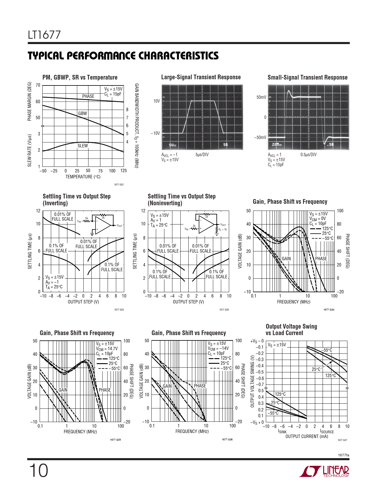 12 12 50 100 0.01% OF V V S = ±15V S = ±15V 2k 5k 5k – FULL SCALE – V V A CM = 0V IN V = 1 10 C V 10 V 40 L = 10pF 80 OUT T 2k OUT + A = 25°C + VIN R 125°C L = 1k PHASE SHIFT (DEG) 25°C µs) 8 µs) 8 30 – 55°C 60 0.01% OF 0.1% OF FULL SCALE 0.01% OF 0.01% OF 6 FULL SCALE 6 FULL SCALE FULL SCALE 20 40 GAIN PHASE 4 0.1% OF 4 10 20 SETTLING TIME ( SETTLING TIME ( VOLTAGE GAIN (dB) FULL SCALE 0.1% OF 0.1% OF 2 VS = ±15V 2 FULL SCALE FULL SCALE 0 0 AV = –1 TA = 25°C 0 0 –10 –20 –10 –8 –6 –4 –2 0 2 4 6 8 10 –10 –8 –6 –4 –2 0 2 4 6 8 10 0.1 1 10 100 OUTPUT STEP (V) OUTPUT STEP (V) FREQUENCY (MHz) 1677 G25 1677 G26 1677 G34