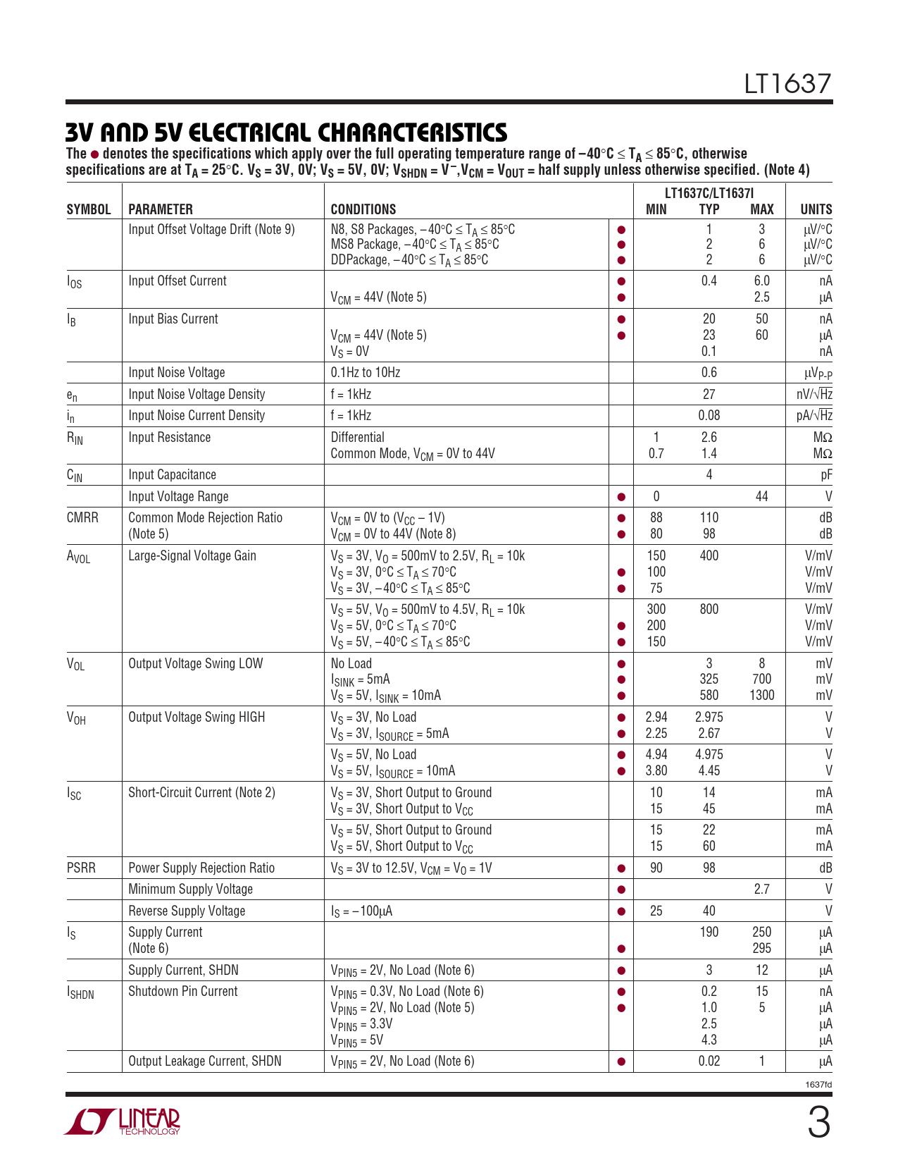 Input Offset Voltage Drift (Note 9) N8, S8 Packages, – 40°C ≤ TA ≤ 85°C ● 1 3 µV/°C MS8 Package, – 40°C ≤ TA ≤ 85°C ● 2 6 µV/°C DDPackage, – 40°C ≤ TA ≤ 85°C ● 2 6 µV/°C IOS Input Offset Current ● 0.4 6.0 nA VCM = 44V (Note 5) ● 2.5 µA IB Input Bias Current ● 20 50 nA VCM = 44V (Note 5) ● 23 60 µA VS = 0V 0.1 nA Input Noise Voltage 0.1Hz to 10Hz 0.6 µVP-P en Input Noise Voltage Density f = 1kHz 27 nV/√Hz in Input Noise Current Density f = 1kHz 0.08 pA/√Hz RIN Input Resistance Differential 1 2.6 MΩ Common Mode, VCM = 0V to 44V 0.7 1.4 MΩ CIN Input Capacitance 4 pF Input Voltage Range ● 0 44 V CMRR Common Mode Rejection Ratio VCM = 0V to (VCC – 1V) ● 88 110 dB (Note 5) VCM = 0V to 44V (Note 8) ● 80 98 dB AVOL Large-Signal Voltage Gain VS = 3V, VO = 500mV to 2.5V, RL = 10k 150 400 V/mV VS = 3V, 0°C ≤ TA ≤ 70°C ● 100 V/mV VS = 3V, – 40°C ≤ TA ≤ 85°C ● 75 V/mV VS = 5V, VO = 500mV to 4.5V, RL = 10k 300 800 V/mV VS = 5V, 0°C ≤ TA ≤ 70°C ● 200 V/mV VS = 5V, – 40°C ≤ TA ≤ 85°C ● 150 V/mV VOL Output Voltage Swing LOW No Load ● 3 8 mV ISINK = 5mA ● 325 700 mV VS = 5V, ISINK = 10mA ● 580 1300 mV VOH Output Voltage Swing HIGH VS = 3V, No Load ● 2.94 2.975 V VS = 3V, ISOURCE = 5mA ● 2.25 2.67 V VS = 5V, No Load ● 4.94 4.975 V VS = 5V, ISOURCE = 10mA ● 3.80 4.45 V ISC Short-Circuit Current (Note 2) VS = 3V, Short Output to Ground 10 14 mA VS = 3V, Short Output to VCC 15 45 mA VS = 5V, Short Output to Ground 15 22 mA VS = 5V, Short Output to VCC 15 60 mA PSRR Power Supply Rejection Ratio VS = 3V to 12.5V, VCM = VO = 1V ● 90 98 dB Minimum Supply Voltage ● 2.7 V Reverse Supply Voltage IS = – 100µA ● 25 40 V IS Supply Current 190 250 µA (Note 6) ● 295 µA Supply Current, SHDN VPIN5 = 2V, No Load (Note 6) ● 3 12 µA ISHDN Shutdown Pin Current VPIN5 = 0.3V, No Load (Note 6) ● 0.2 15 nA VPIN5 = 2V, No Load (Note 5) ● 1.0 5 µA VPIN5 = 3.3V 2.5 µA VPIN5 = 5V 4.3 µA Output Leakage Current, SHDN VPIN5 = 2V, No Load (Note 6) ● 0.02 1 µA 1637fd 3