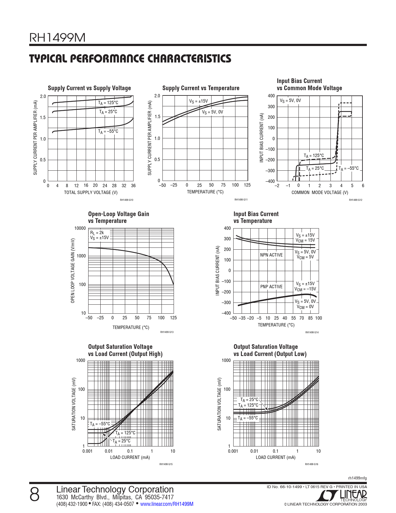 10000 400 RL = 2k V VS = ±15V S = ±15V 300 VCM = 15V 200 VS = 5V, 0V 1000 NPN ACTIVE V 100 CM = 5V 0 –100 100 VS = ±15V PNP ACTIVE VCM = –15V INPUT BIAS CURRENT (nA) –200 OPEN LOOP VOLTAGE GAIN (V/mV) –300 VS = 5V, 0V VCM = 0V 10 –400 –50 –25 0 25 50 75 100 125 –50 –35 –20 –5 10 25 40 55 70 85 100 TEMPERATURE (°C) TEMPERATURE (°C) RH1499 G13 RH1499 G14