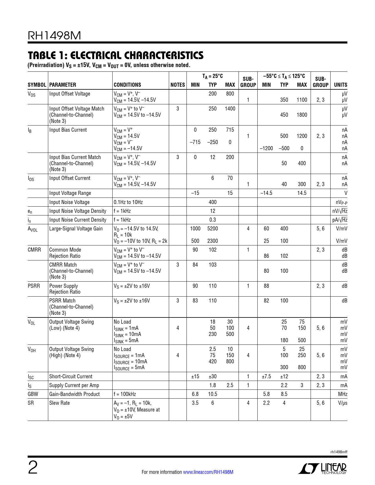VOS Input Offset Voltage VCM = V+, V– 200 800 µV VCM = 14.5V, –14.5V 1 350 1100 2, 3 µV Input Offset Voltage Match VCM = V+ to V– 3 250 1400 µV (Channel-to-Channel) VCM = 14.5V to –14.5V 450 1800 µV (Note 3) IB Input Bias Current VCM = V+ 0 250 715 nA VCM = 14.5V 1 500 1200 2, 3 nA VCM = V– –715 –250 0 nA VCM = –14.5V –1200 –500 0 nA Input Bias Current Match VCM = V+, V– 3 0 12 200 nA (Channel-to-Channel) VCM = 14.5V, –14.5V 50 400 nA (Note 3) IOS Input Offset Current VCM = V+, V– 6 70 nA VCM = 14.5V, –14.5V 1 40 300 2, 3 nA Input Voltage Range –15 15 –14.5 14.5 V Input Noise Voltage 0.1Hz to 10Hz 400 nVP-P en Input Noise Voltage Density f = 1kHz 12 nV/√Hz in Input Noise Current Density f = 1kHz 0.3 pA/√Hz AVOL Large-Signal Voltage Gain VO = –14.5V to 14.5V, 1000 5200 4 60 400 5, 6 V/mV RL = 10k VO = –10V to 10V, RL = 2k 500 2300 25 100 V/mV CMRR Common Mode VCM = V+ to V– 90 102 1 2, 3 dB Rejection Ratio VCM = 14.5V to –14.5V 86 102 dB CMRR Match VCM = V+ to V– 3 84 103 dB (Channel-to-Channel) VCM = 14.5V to –14.5V 80 100 dB (Note 3) PSRR Power Supply VS = ±2V to ±16V 90 110 1 88 2, 3 dB Rejection Ratio PSRR Match VS = ±2V to ±16V 3 83 110 82 100 dB (Channel-to-Channel) (Note 3) VOL Output Voltage Swing No Load 18 30 25 75 mV (Low) (Note 4) ISINK = 1mA 4 50 100 4 70 150 5, 6 mV ISINK = 10mA 230 500 mV ISINK = 5mA 180 500 mV VOH Output Voltage Swing No Load 2.5 10 5 25 mV (High) (Note 4) ISOURCE = 1mA 4 75 150 4 100 250 5, 6 mV ISOURCE = 10mA 420 800 mV ISOURCE = 5mA 300 800 mV ISC Short-Circuit Current ±15 ±30 1 ±7.5 ±12 2, 3 mA IS Supply Current per Amp 1.8 2.5 1 2.2 3 2, 3 mA GBW Gain-Bandwidth Product f = 100kHz 6.8 10.5 5.8 8.5 MHz SR Slew Rate AV = –1, RL = 10k, 3.5 6 4 2.2 4 5, 6 V/µs VO = ±10V, Measure at VO = ±5V rh1498mff 2 For more information www.linear.com/RH1498M Document Outline Description Absolute Maximum Ratings Burn-In Circuit Package Information Table 1: Electrical Characteristics Table 1A: Electrical Characteristics Table 2: Electrical Characteristics Table 2A: Electrical Characteristics TYPICAL PERFORMANCE CHARACTERISTICS