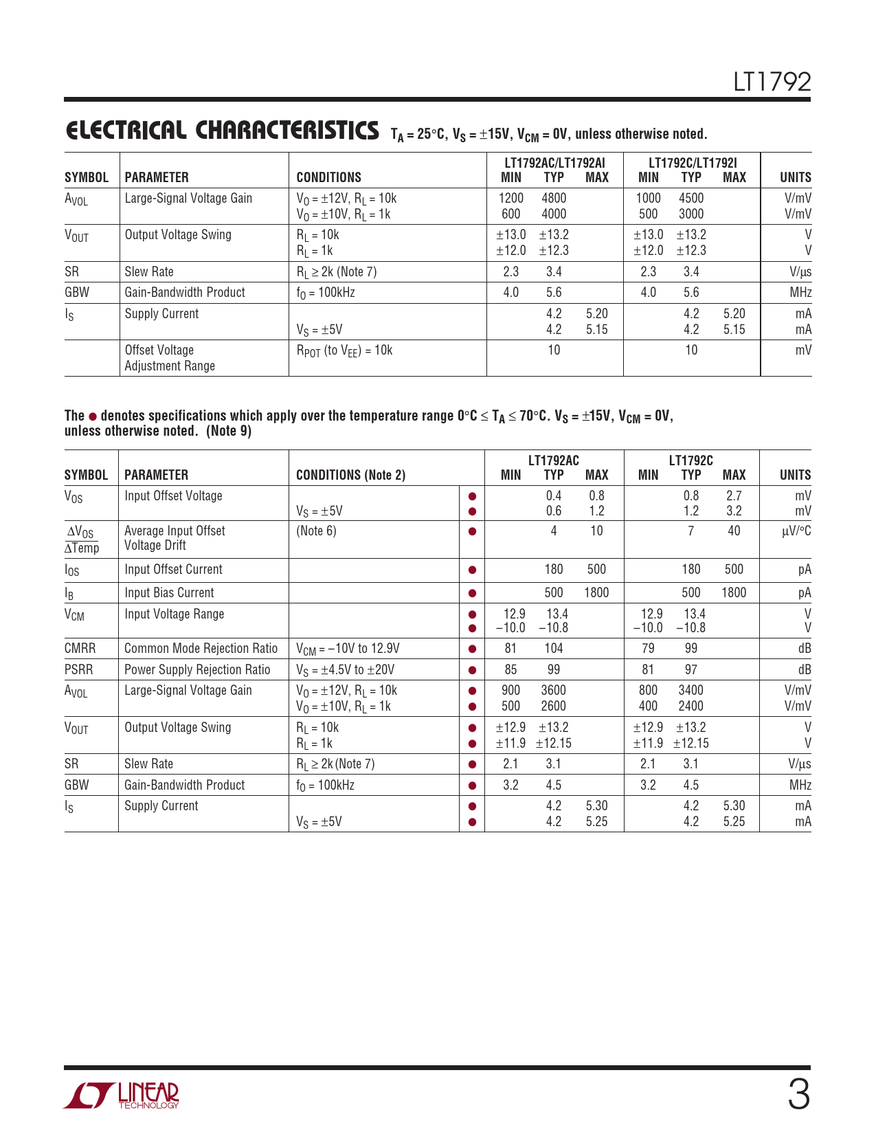 15V, VCM = 0V, unless otherwise noted. (Note 9) LT1792AC LT1792C SYMBOL PARAMETER CONDITIONS (Note 2) MIN TYP MAX MIN TYP MAX UNITS