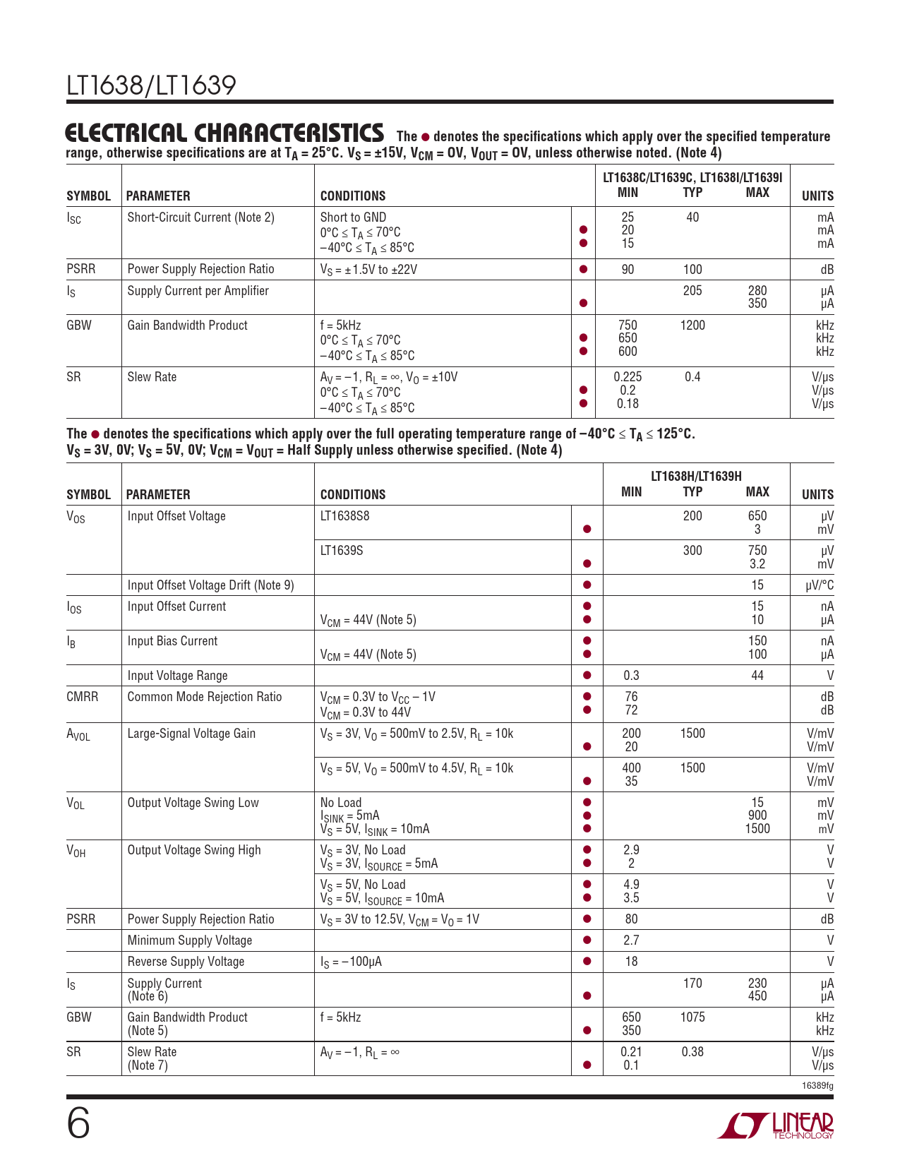 denotes the specifi cations which apply over the specifi ed temperature range, otherwise specifi cations are at TA = 25°C. VS = ±15V, VCM = OV, VOUT = OV, unless otherwise noted. (Note 4) LT1638C/LT1639C, LT1638I/LT1639I SYMBOL PARAMETER CONDITIONS MIN TYP MAX UNITS