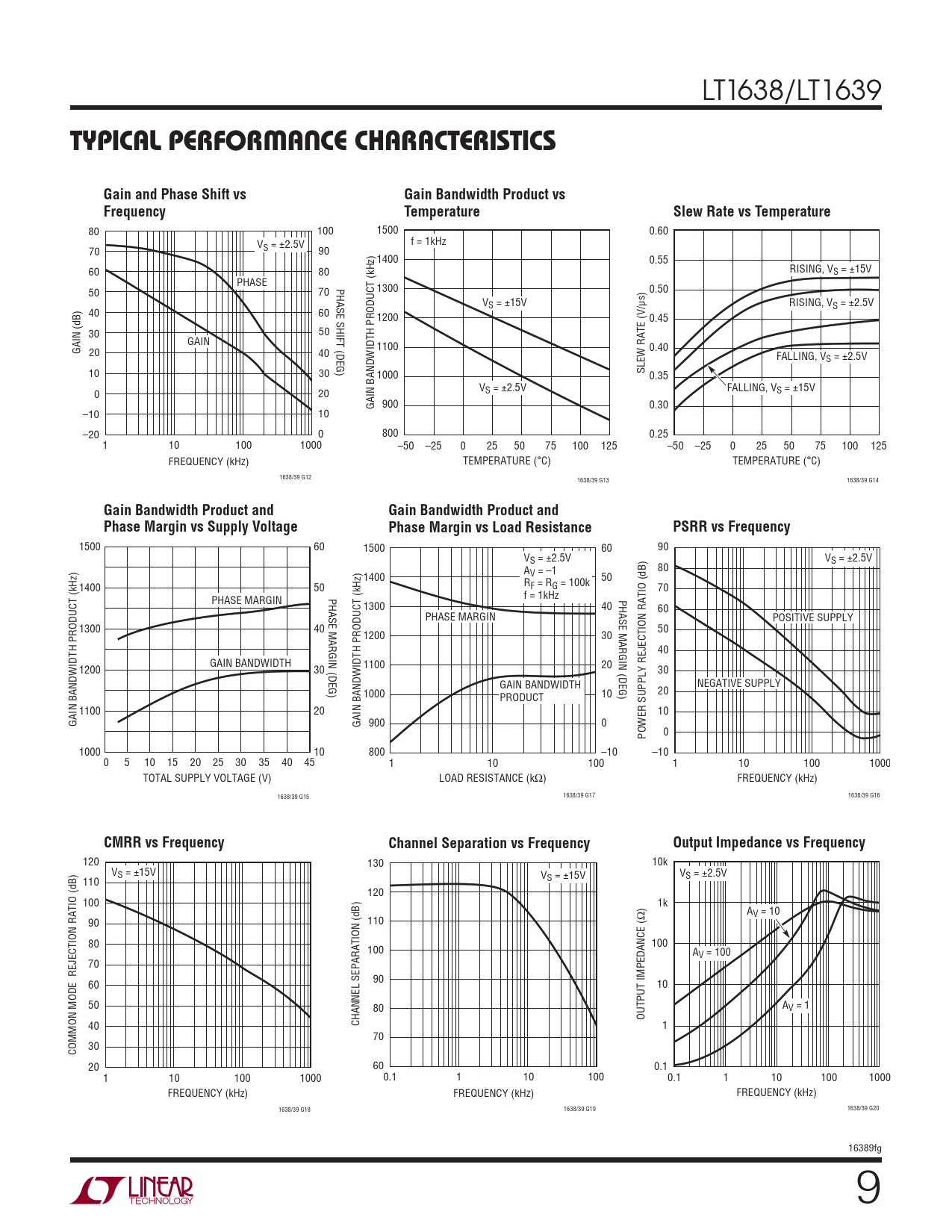 120 130 10k VS = ±15V V V S = ±2.5V 110 S = ±15V 120 100 1k AV = 10 90 110 80 100 100 AV = 100 70 90 60 10 50 A 80 V = 1 OUTPUT IMPEDANCE (Ω) 40 CHANNEL SEPARATION (dB) 1 70 COMMON MODE REJECTION RATIO (dB) 30 20 60 0.1 1 10 100 1000 0.1 1 10 100 0.1 1 10 100 1000 FREQUENCY (kHz) FREQUENCY (kHz) FREQUENCY (kHz) 1638/39 G19 1638/39 G20 1638/39 G18 16389fg 9
