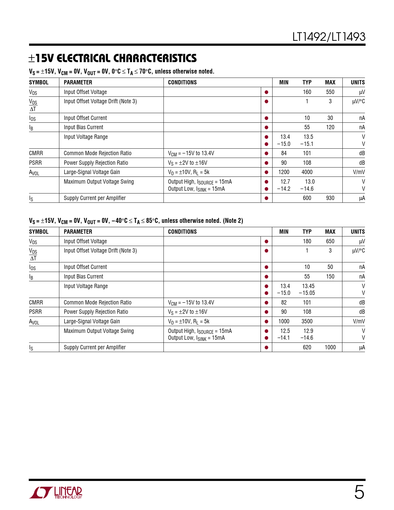 LT1492/LT1493 ± 15V ELECTRICAL CHARACTERISTICSVS = ± 15V, VCM = 0V, VOUT = 0V, 0 ° C ≤ TA ≤ 70 ° C, unless otherwise noted.SYMBOLPARAMETERCONDITIONSMINTYPMAXUNITS VOS Input Offset Voltage ● 160 550 µV VOS Input Offset Voltage Drift (Note 3) ● 1 3 µV/°C ∆T IOS Input Offset Current ● 10 30 nA IB Input Bias Current ● 55 120 nA Input Voltage Range ● 13.4 13.5 V ● – 15.0 – 15.1 V CMRR Common Mode Rejection Ratio VCM = – 15V to 13.4V ● 84 101 dB PSRR Power Supply Rejection Ratio VS = ±2V to ±16V ● 90 108 dB AVOL Large-Signal Voltage Gain VO = ±10V, RL = 5k ● 1200 4000 V/mV Maximum Output Voltage Swing Output High, ISOURCE = 15mA ● 12.7 13.0 V Output Low, ISINK = 15mA ● – 14.2 – 14.6 V IS Supply Current per Amplifier ● 600 930 µA VS = ± 15V, VCM = 0V, VOUT = 0V, –40 ° C ≤ TA ≤ 85 ° C, unless otherwise noted. (Note 2)SYMBOLPARAMETERCONDITIONSMINTYPMAXUNITS VOS Input Offset Voltage ● 180 650 µV VOS Input Offset Voltage Drift (Note 3) ● 1 3 µV/°C ∆T IOS Input Offset Current ● 10 50 nA IB Input Bias Current ● 55 150 nA Input Voltage Range ● 13.4 13.45 V ● – 15.0 – 15.05 V CMRR Common Mode Rejection Ratio VCM = – 15V to 13.4V ● 82 101 dB PSRR Power Supply Rejection Ratio VS = ±2V to ±16V ● 90 108 dB AVOL Large-Signal Voltage Gain VO = ±10V, RL = 5k ● 1000 3500 V/mV Maximum Output Voltage Swing Output High, ISOURCE = 15mA ● 12.5 12.9 V Output Low, ISINK = 15mA ● –14.1 –14.6 V IS Supply Current per Amplifier ● 620 1000 µA 5