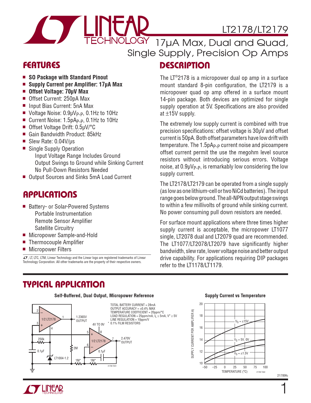 LT2178/LT2179 17µA Max, Dual and Quad, Single Supply, Precision Op Amps