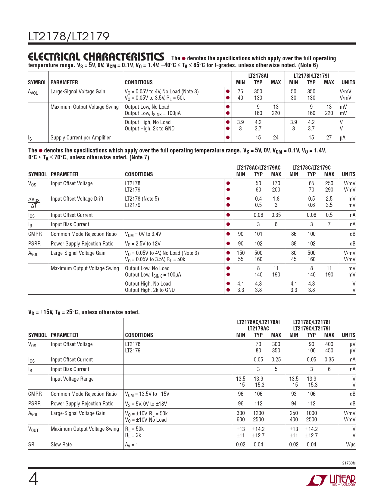 denotes the specifi cations which apply over the full operating temperature range. VS = 5V, 0V, VCM = 0.1V, VO = 1.4V, –40°C ≤ TA ≤ 85°C for I-grades, unless otherwise noted. (Note 6) LT2178AI LT2178I/LT2179I SYMBOL PARAMETER CONDITIONS MIN TYP MAX MIN TYP MAX UNITS