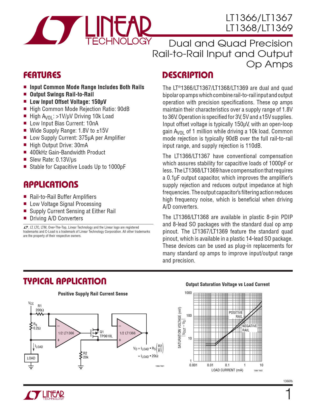 LT1366/LT1367 LT1368/LT1369 Dual and Quad Precision Rail-to-Rail Input and Output Op Amps FeaTures DescripTion n