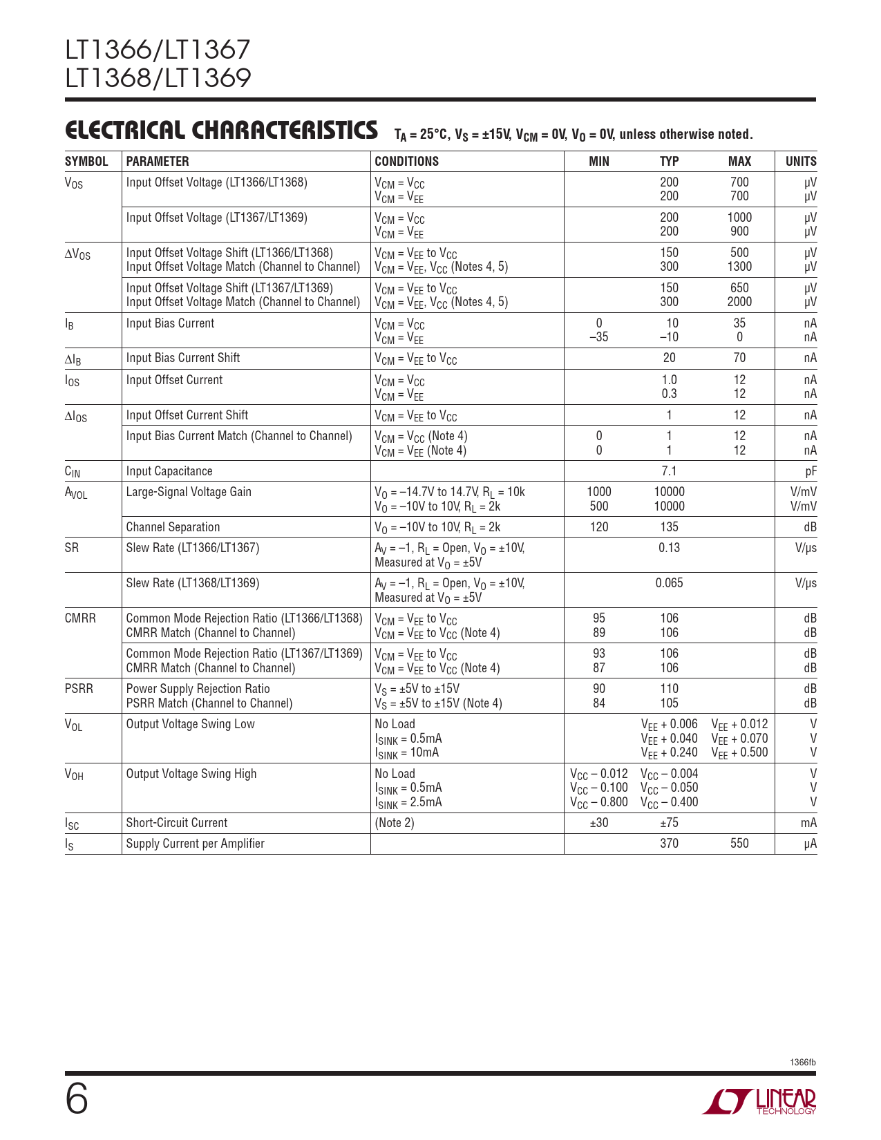 VOS Input Offset Voltage (LT1366/LT1368) VCM = VCC 200 700 µV VCM = VEE 200 700 µV Input Offset Voltage (LT1367/LT1369) VCM = VCC 200 1000 µV VCM = VEE 200 900 µV ∆VOS Input Offset Voltage Shift (LT1366/LT1368) VCM = VEE to VCC 150 500 µV Input Offset Voltage Match (Channel to Channel) VCM = VEE, VCC (Notes 4, 5) 300 1300 µV Input Offset Voltage Shift (LT1367/LT1369) VCM = VEE to VCC 150 650 µV Input Offset Voltage Match (Channel to Channel) VCM = VEE, VCC (Notes 4, 5) 300 2000 µV IB Input Bias Current VCM = VCC 0 10 35 nA VCM = VEE –35 –10 0 nA ∆IB Input Bias Current Shift VCM = VEE to VCC 20 70 nA IOS Input Offset Current VCM = VCC 1.0 12 nA VCM = VEE 0.3 12 nA ∆IOS Input Offset Current Shift VCM = VEE to VCC 1 12 nA Input Bias Current Match (Channel to Channel) VCM = VCC (Note 4) 0 1 12 nA VCM = VEE (Note 4) 0 1 12 nA CIN Input Capacitance 7.1 pF AVOL Large-Signal Voltage Gain VO = –14.7V to 14.7V, RL = 10k 1000 10000 V/mV VO = –10V to 10V, RL = 2k 500 10000 V/mV Channel Separation VO = –10V to 10V, RL = 2k 120 135 dB SR Slew Rate (LT1366/LT1367) AV = –1, RL = Open, VO = ±10V, 0.13 V/µs Measured at VO = ±5V Slew Rate (LT1368/LT1369) AV = –1, RL = Open, VO = ±10V, 0.065 V/µs Measured at VO = ±5V CMRR Common Mode Rejection Ratio (LT1366/LT1368) VCM = VEE to VCC 95 106 dB CMRR Match (Channel to Channel) VCM = VEE to VCC (Note 4) 89 106 dB Common Mode Rejection Ratio (LT1367/LT1369) VCM = VEE to VCC 93 106 dB CMRR Match (Channel to Channel) VCM = VEE to VCC (Note 4) 87 106 dB PSRR Power Supply Rejection Ratio VS = ±5V to ±15V 90 110 dB PSRR Match (Channel to Channel) VS = ±5V to ±15V (Note 4) 84 105 dB VOL Output Voltage Swing Low No Load VEE + 0.006 VEE + 0.012 V ISINK = 0.5mA VEE + 0.040 VEE + 0.070 V ISINK = 10mA VEE + 0.240 VEE + 0.500 V VOH Output Voltage Swing High No Load VCC – 0.012 VCC – 0.004 V ISINK = 0.5mA VCC – 0.100 VCC – 0.050 V ISINK = 2.5mA VCC – 0.800 VCC – 0.400 V ISC Short-Circuit Current (Note 2) ±30 ±75 mA IS Supply Current per Amplifier 370 550 µA 1366fb Document Outline Features Description Applications Typical Application Absolute Maximum Ratings Available Options Order Information Electrical Characteristics Typical Performance Characteristics Applications information Typical Applications Package Description Revision History Typical Application Related Parts