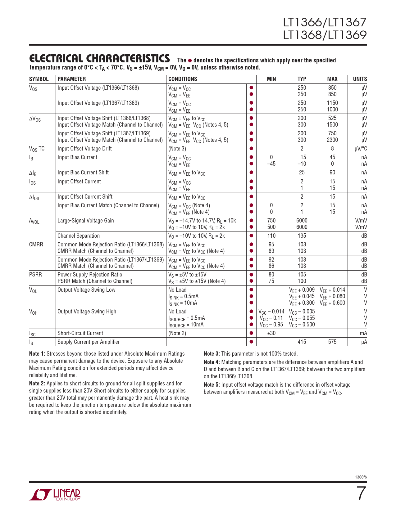 VOS Input Offset Voltage (LT1366/LT1368) VCM = VCC l 250 850 µV VCM = VEE l 250 850 µV Input Offset Voltage (LT1367/LT1369) VCM = VCC l 250 1150 µV VCM = VEE l 250 1000 µV ∆VOS Input Offset Voltage Shift (LT1366/LT1368) VCM = VEE to VCC l 200 525 µV Input Offset Voltage Match (Channel to Channel) VCM = VEE, VCC (Notes 4, 5) l 300 1500 µV Input Offset Voltage Shift (LT1367/LT1369) VCM = VEE to VCC l 200 750 µV Input Offset Voltage Match (Channel to Channel) VCM = VEE, VCC (Notes 4, 5) l 300 2300 µV VOS TC Input Offset Voltage Drift (Note 3) l 2 8 µV/°C IB Input Bias Current VCM = VCC l 0 15 45 nA VCM = VEE l –45 –10 0 nA ∆IB Input Bias Current Shift VCM = VEE to VCC l 25 90 nA IOS Input Offset Current VCM = VCC l 2 15 nA VCM = VEE l 1 15 nA ∆IOS Input Offset Current Shift VCM = VEE to VCC l 2 15 nA Input Bias Current Match (Channel to Channel) VCM = VCC (Note 4) l 0 2 15 nA VCM = VEE (Note 4) l 0 1 15 nA AVOL Large-Signal Voltage Gain VO = –14.7V to 14.7V, RL = 10k l 750 6000 V/mV VO = –10V to 10V, RL = 2k l 500 6000 V/mV Channel Separation VO = –10V to 10V, RL = 2k l 110 135 dB CMRR Common Mode Rejection Ratio (LT1366/LT1368) VCM = VEE to VCC l 95 103 dB CMRR Match (Channel to Channel) VCM = VEE to VCC (Note 4) l 89 103 dB Common Mode Rejection Ratio (LT1367/LT1369) VCM = VEE to VCC l 92 103 dB CMRR Match (Channel to Channel) VCM = VEE to VCC (Note 4) l 86 103 dB PSRR Power Supply Rejection Ratio VS = ±5V to ±15V l 80 105 dB PSRR Match (Channel to Channel) VS = ±5V to ±15V (Note 4) l 75 100 dB VOL Output Voltage Swing Low No Load l VEE + 0.009 VEE + 0.014 V ISINK = 0.5mA l VEE + 0.045 VEE + 0.080 V ISINK = 10mA l VEE + 0.300 VEE + 0.600 V VOH Output Voltage Swing High No Load l VCC – 0.014 VCC – 0.005 V ISOURCE = 0.5mA l VCC – 0.11 VCC – 0.055 V ISOURCE = 10mA l VCC – 0.95 VCC – 0.500 V ISC Short-Circuit Current (Note 2) l ±30 mA IS Supply Current per Amplifier l 415 575 µA